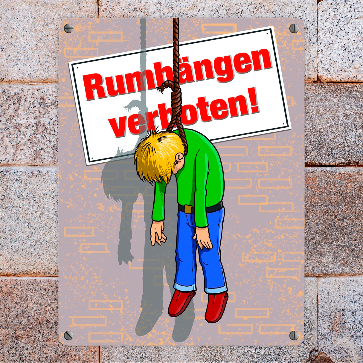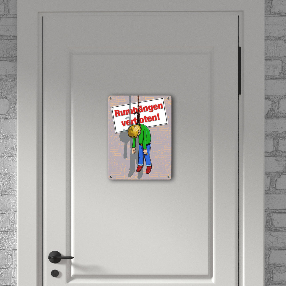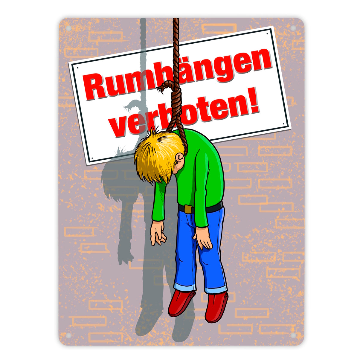 - 1x Metallschild Rumhängen verboten! Galgenhumor Henkersknoten erhängt Comic in der gewählten Größe