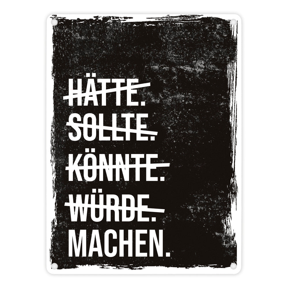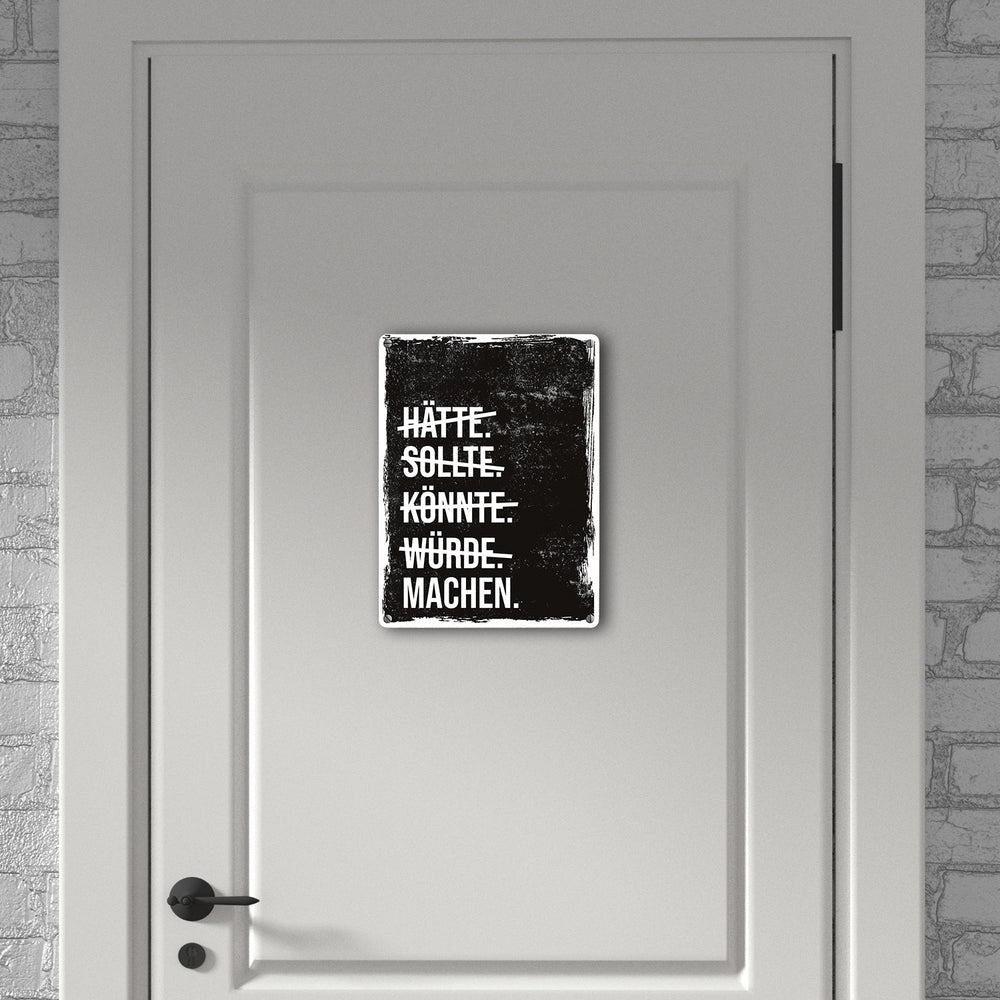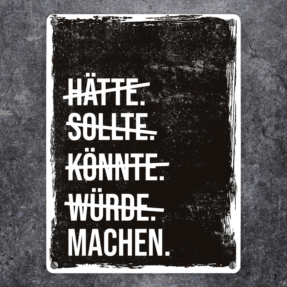 Das Motivation Metallschild in 15x20 cm ist eine tolle Geschenkidee für dich selbst oder deine Freunde. Es ist aus hochwertigem Aluminiumblech hergestellt und mit Sorgfalt in Handarbeit gefertigt. Das Vintage-Design erinnert an die vier durchgestrichenen Worte: 'Hätte', 'Sollte', 'Könnte' und 'Würde' und unterstreicht das Wort „Machen“. Dank der vorgebohrten Löcher kannst du es ganz einfach überall befestigen und so überall deine Ziele erreichen. Mit diesem motivierenden Metallschild schaffst du dir den perfekten Ansporn, um deine Träume Schritt für Schritt zu verwirklichen!