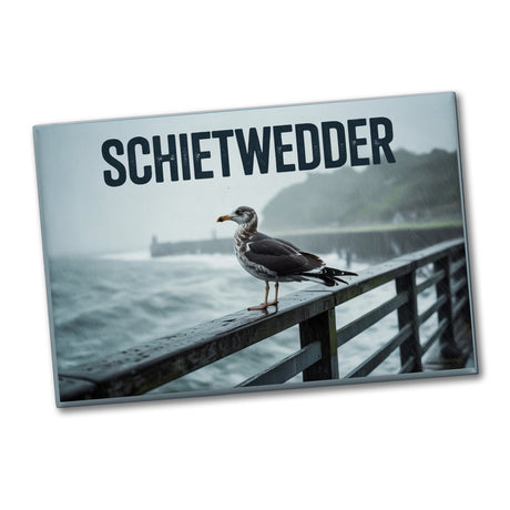 - Der Möwe im Regen Schietwedder Souvenir-Magnet ist ein eckiger Magnet mit einem Vintage-Design. Er zeigt eine dunkelgraue Möwe, die auf einem Holzgeländer sitzt, während ein Regensturm tobt. Der Hintergrund besteht aus einer verschwommenen, nebeligen Meereslandschaft, die die Atmosphäre der norddeutschen Küste einfängt.