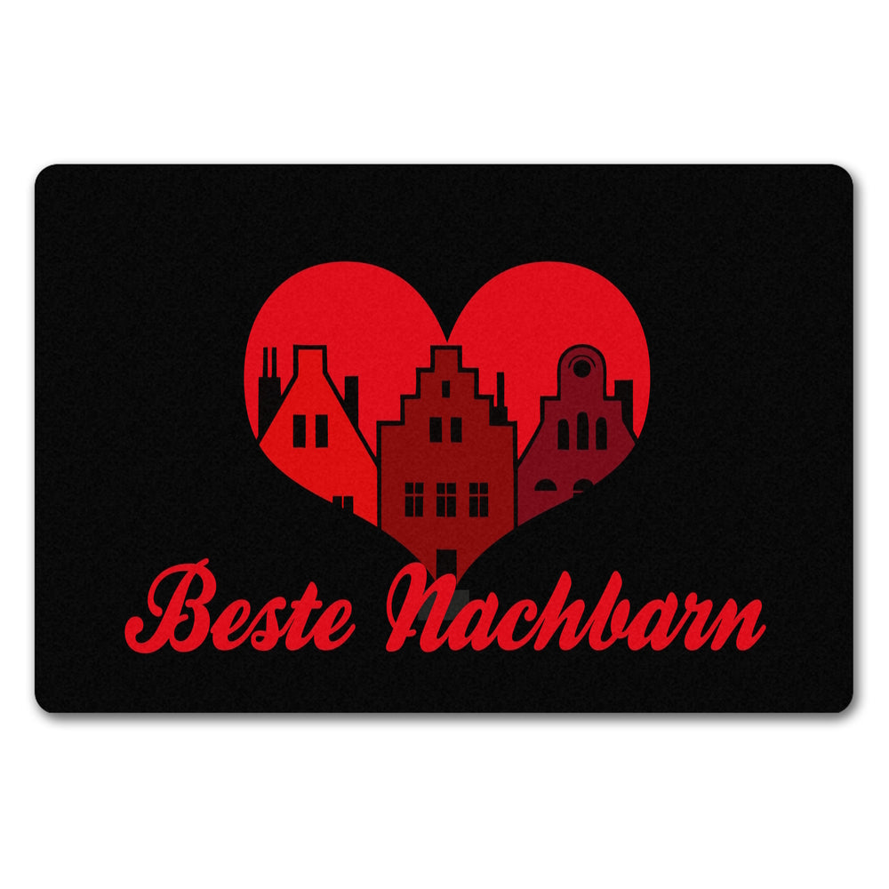 - Treten Sie ein ins Reich der Herzlichkeit – mit unserer "Beste Nachbarn" Fußmatte! Stolz präsentiert sie eine charmante Häuserfront, die sich gemütlich in einem Herz schmiegt. Für alle, die beim Heimkommen schon Liebe unter den Füßen spüren wollen!