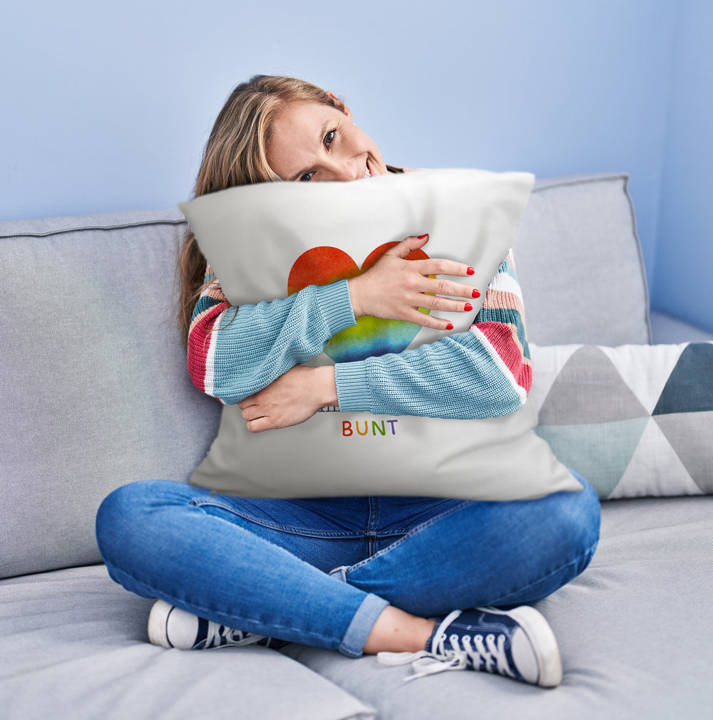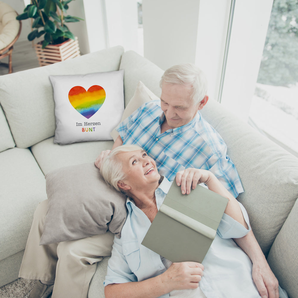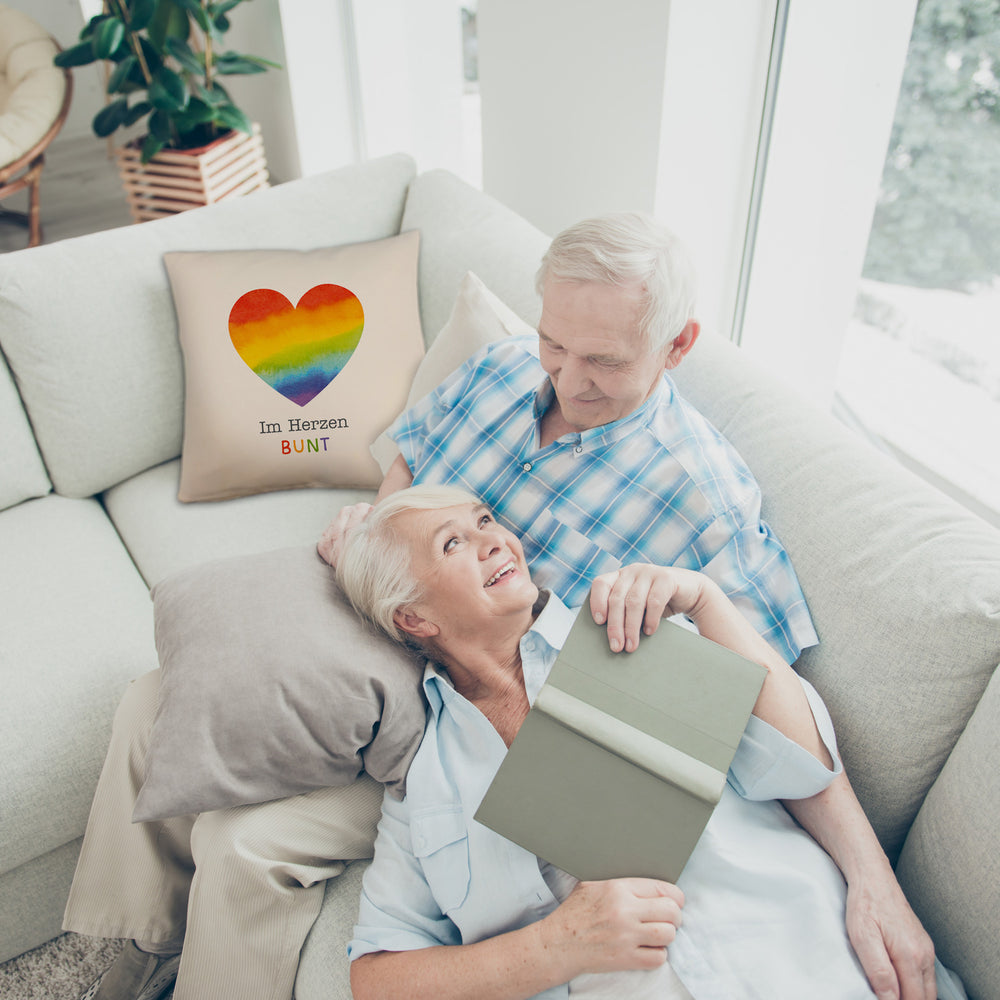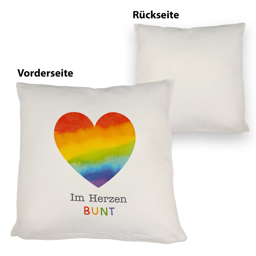• 1x Regenbogenherz Kissen mit Spruch Im Herzen bunt in der gewählten Ausführung