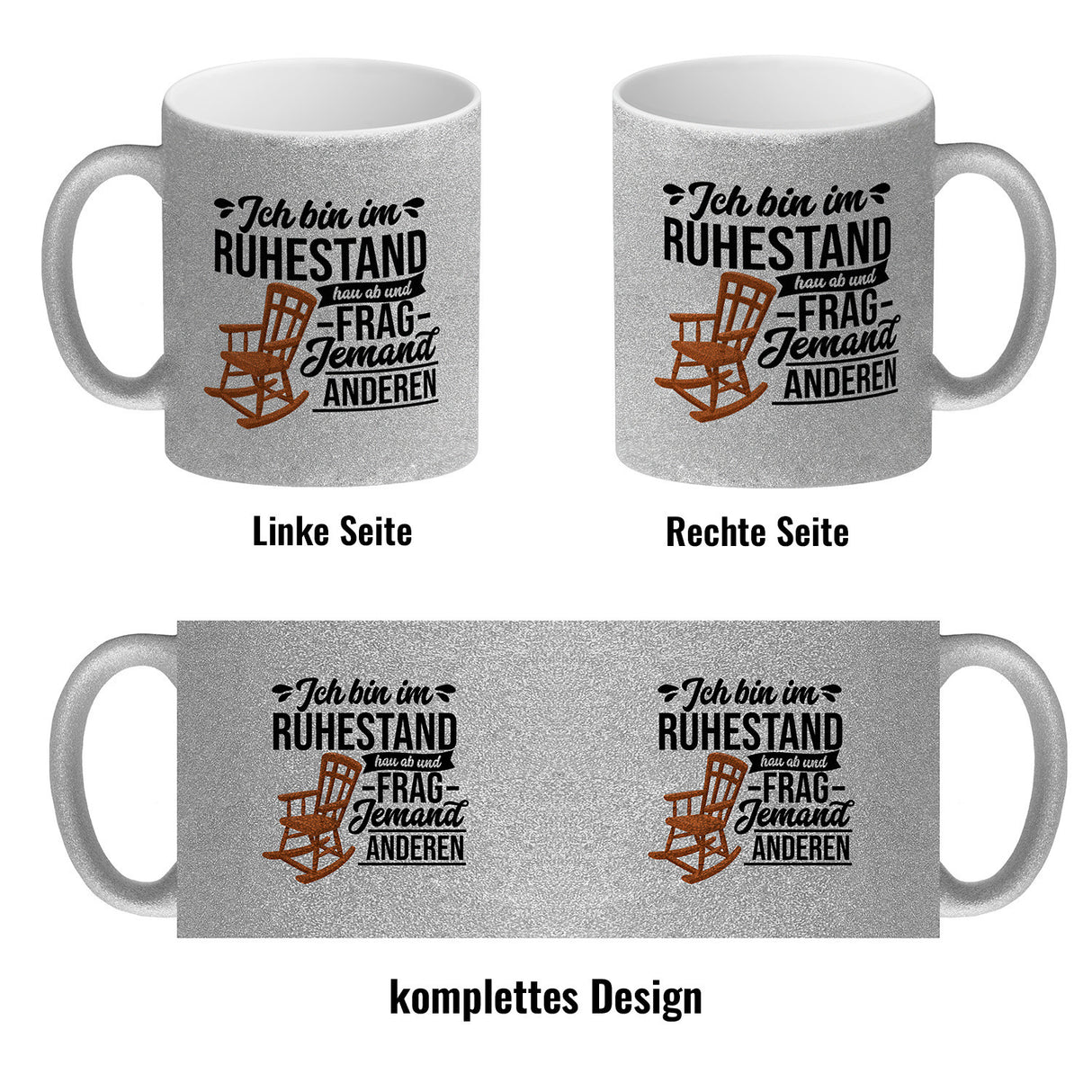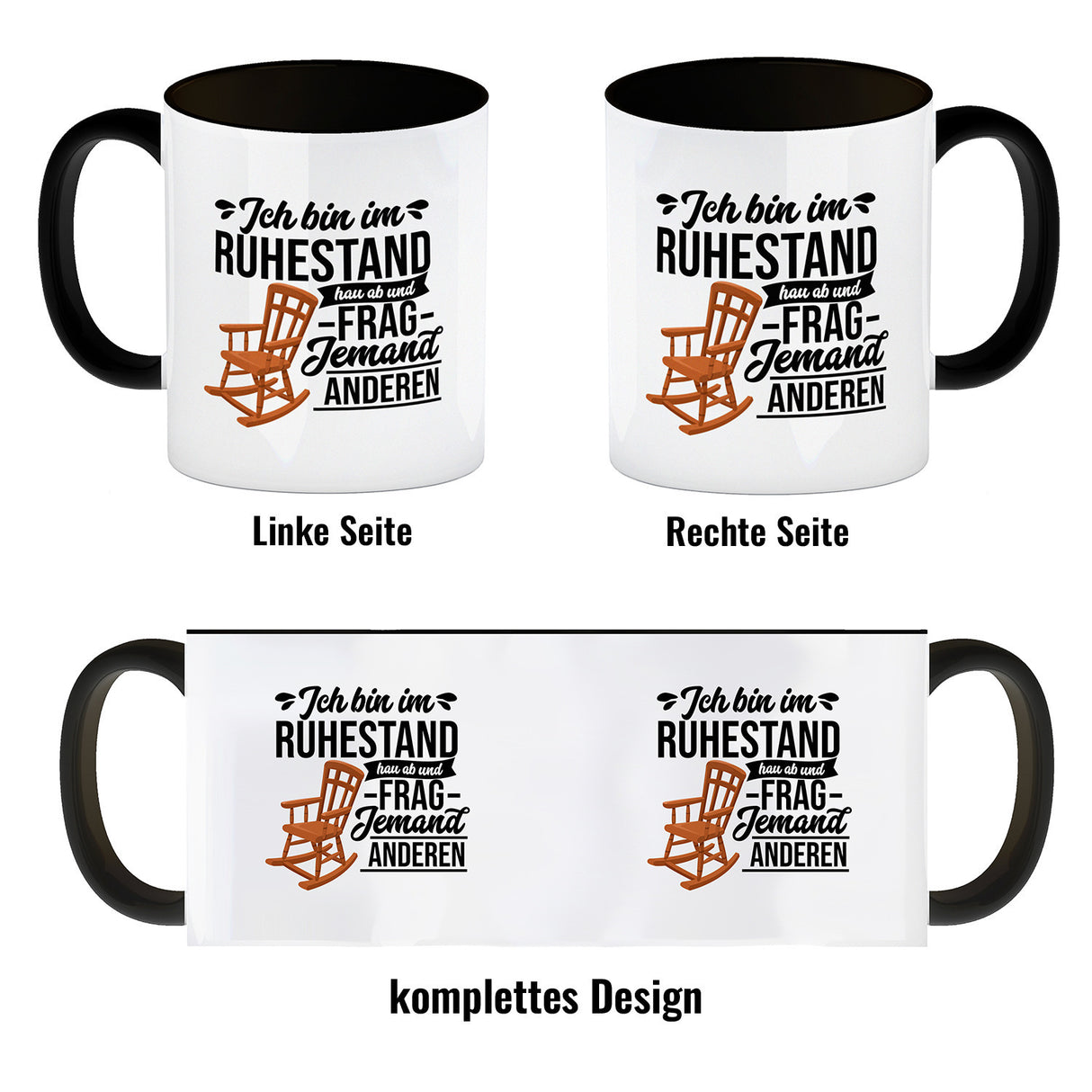 - Der witzige Kaffeebecher mit Schaukelstuhl Motiv erweckt Interesse und ist eine tolle Geschenkidee für Eltern zum Vorruhestand. Der Becher trägt den Spruch: "Ich bin im Ruhestand hau ab und frag jemand anderen". Dieser lustige Spruch über die Rente vermittelt Einzigartigkeit, Humor und Freude.