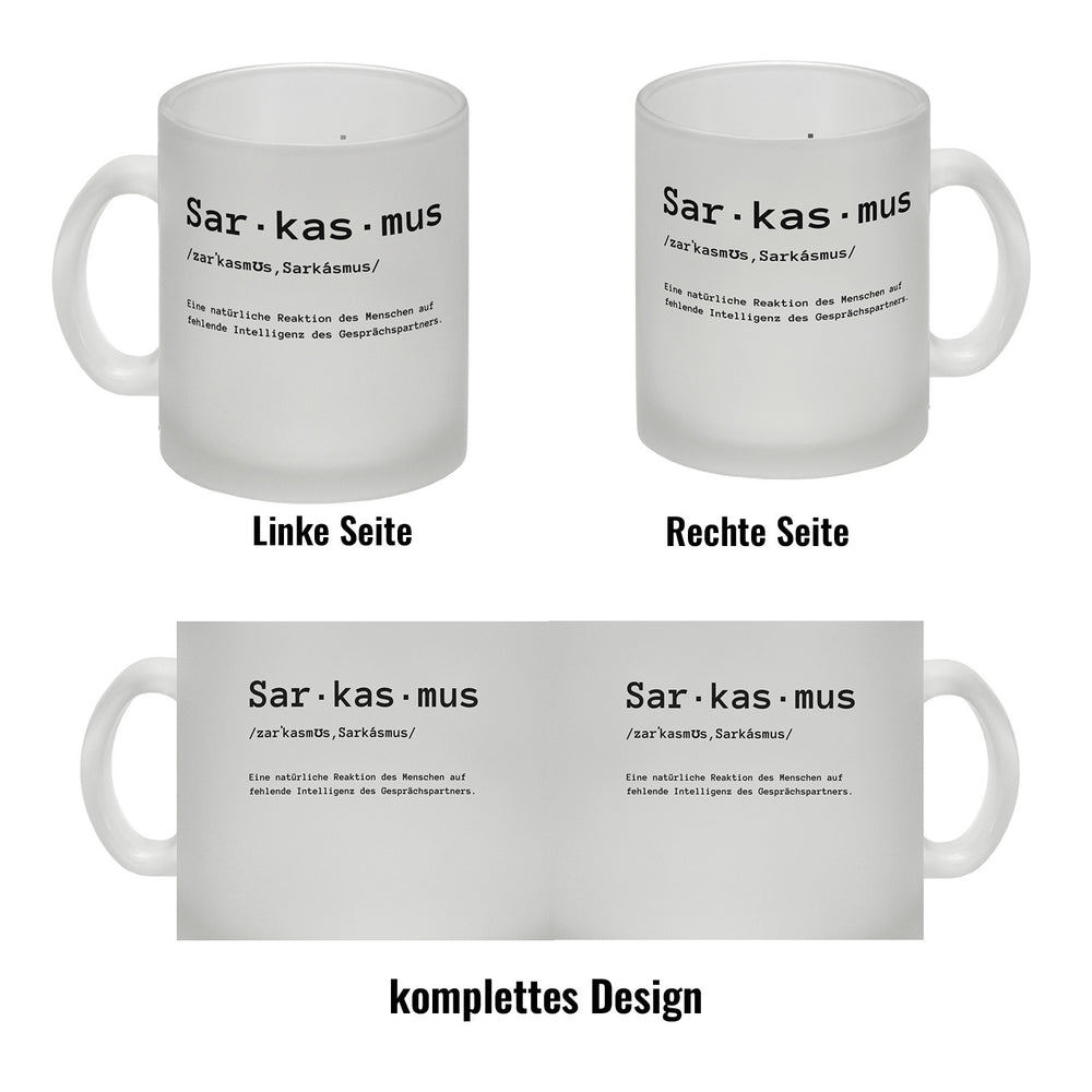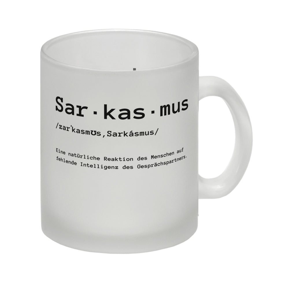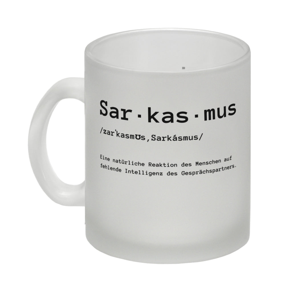 - Dieser geniale Kaffeebecher mit Sarkasmus Motiv ist das ideale Geschenk für jeden, der die Ironie liebt. Auf dem Becher steht ein witziger Spruch, der die Definition von Sarkasmus beschreibt: „Sarkasmus. Eine natürliche Reaktion des Menschen auf fehlende Intelligenz des Gesprächspartners“.