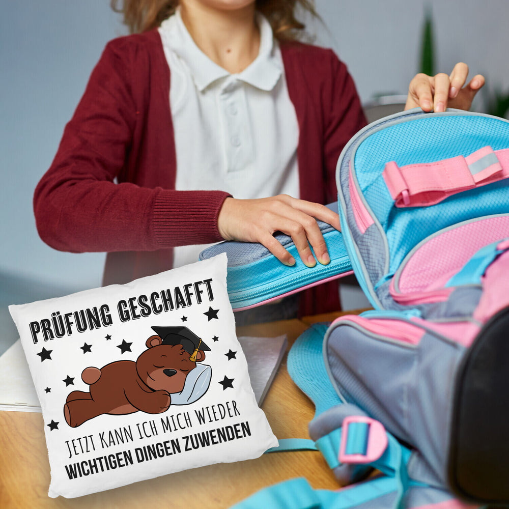 • Endlich hat der Prüfungsstress ein Ende und das "Prüfung geschafft Kissen" wartet schon! Flaue Nerven adieu, Hallo Schlummerparadies! Der relaxte Braunbär mit Doktorhut demonstriert, wie's geht: Kopf aufs Kissen, Augen zu, und auf zu den wichtigen Dingen – wie ausgiebige Nickerchen.