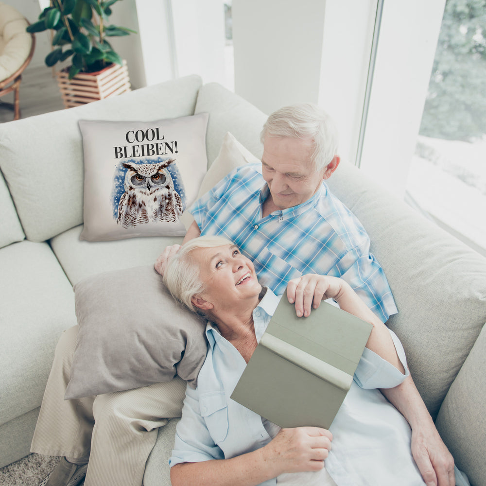 • Dieses lustige Kissen begeistert mit einem charmanten Motiv: Eine coole Schneeeule mit stylischer Sonnenbrille posiert im Schnee. Die detaillierten Federzeichnungen heben sich vor einem pastellfarbenen Aquarellhintergrund ab und fangen die Magie des Winters ein. Die Worte COOL BLEIBEN! runden das Design ab und versprühen locker-elegante Nonchalance.