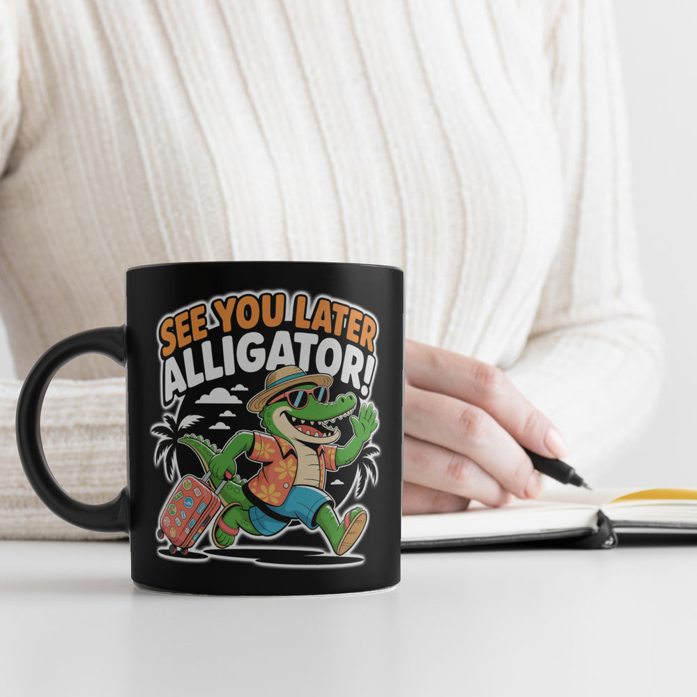 - Die "See you later alligator!" Tasse bringt tropischen Spaß direkt in deinen Alltag! Mit einem fröhlichen Alligator in stylischer Sonnenbrille, Strohhut und Hawaiihemd, joggend mit Koffer, ist sie ein Hingucker. Der schwarze Hintergrund mit Palmensilhouetten und der verspielte Schriftzug runden das Design perfekt ab.