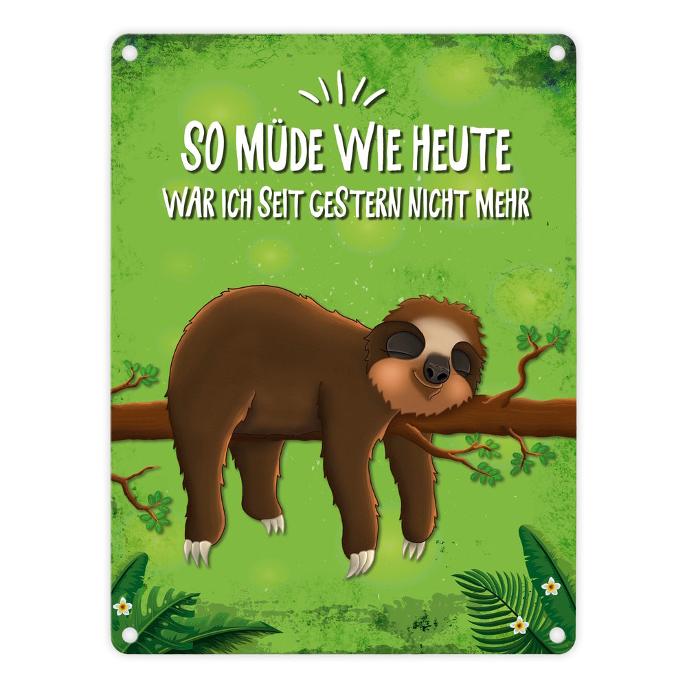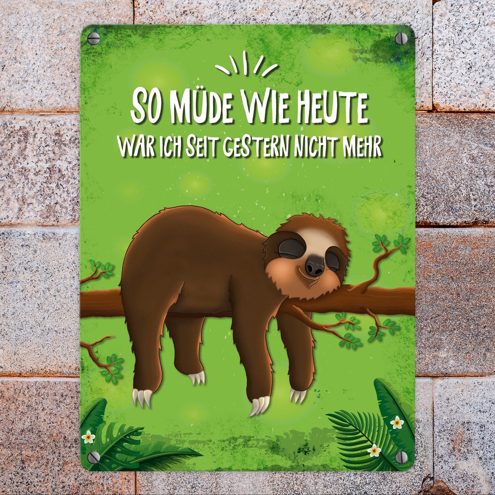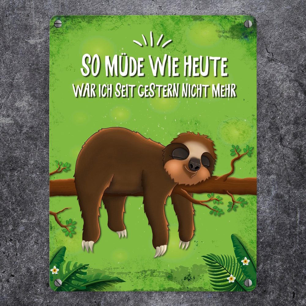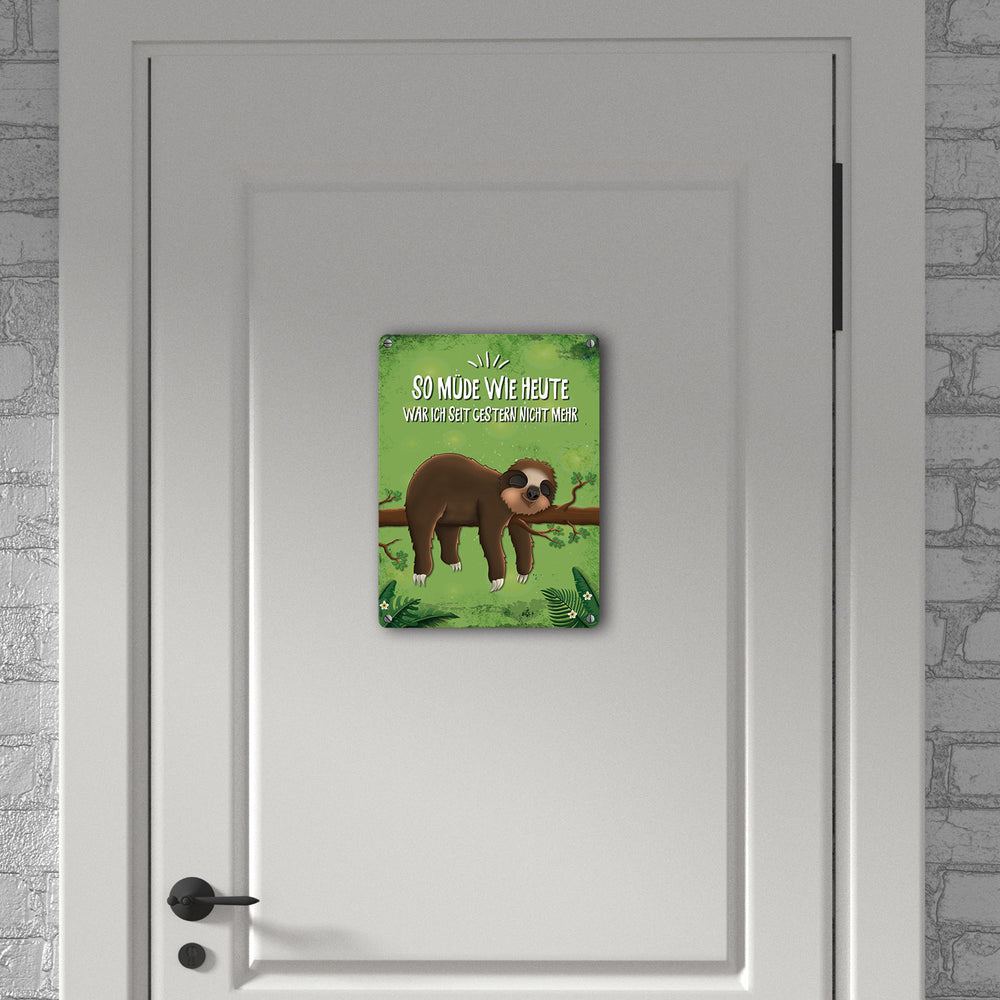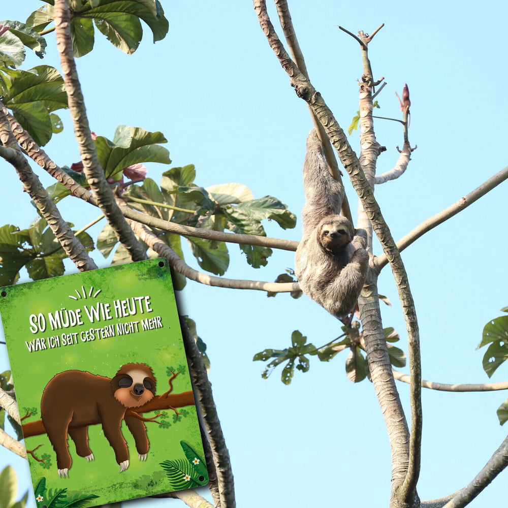 - Lieferumfang: 1x Metallschild mit Faultier auf Baum Motiv und Spruch: So müde wie heute war ich seit ...
