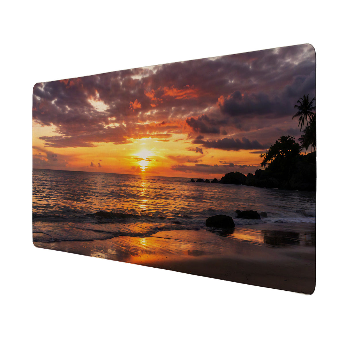 - Diese Schreibtischunterlage bringt das tropische Flair direkt zu dir ins Homeoffice. Mit einem atemberaubenden Motiv eines Sonnenuntergangs am Meer, zeigt sie lebendige Orangetöne, rote und gelbe Pinselstriche am Himmel. Palmen und Felsen rahmen das Bild ein, während das Licht sanft auf dem Ozean glitzert.