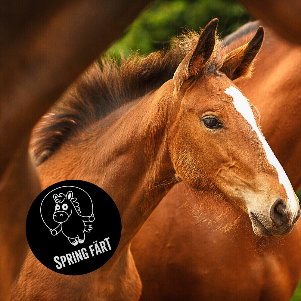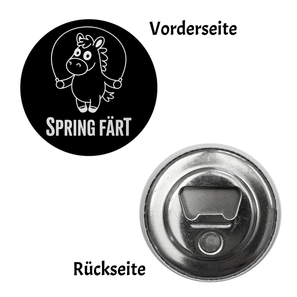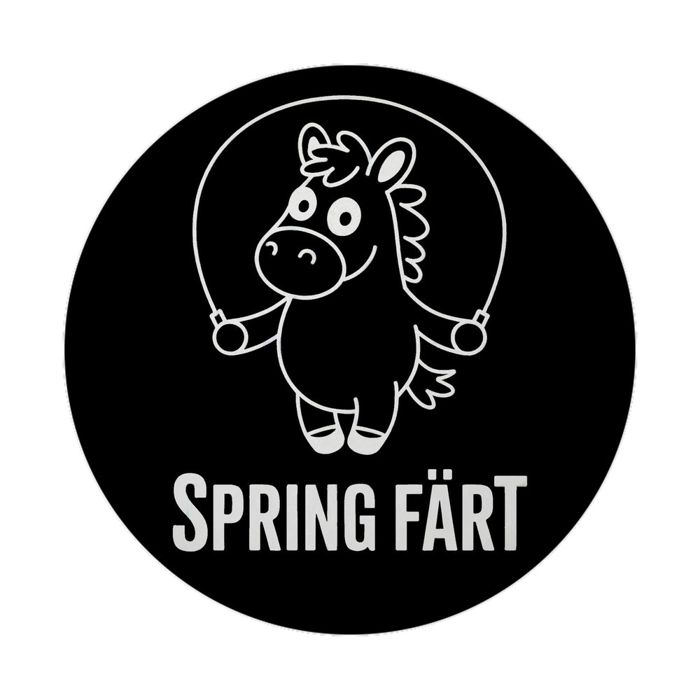 - Der Spring Färt Magnet ist rund und zeigt ein lustiges Cartoon-Pferd mit überraschtem Gesichtsausdruck, das in der Luft springt. Auf schwarzem Hintergrund hebt sich das weiße Pferd besonders ab. Der witzige Spruch "SPRING FÄRT" in fetten Buchstaben rundet das spaßige Design ab.