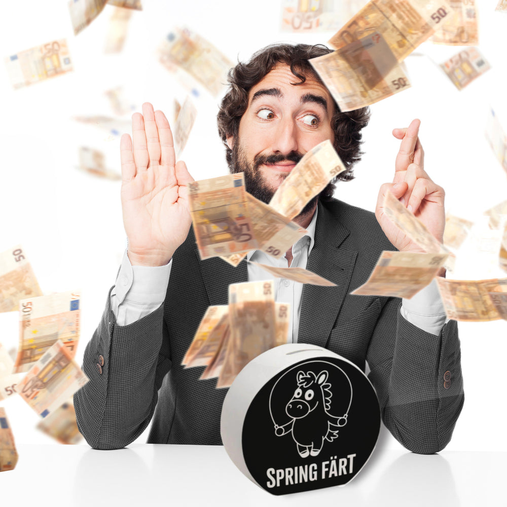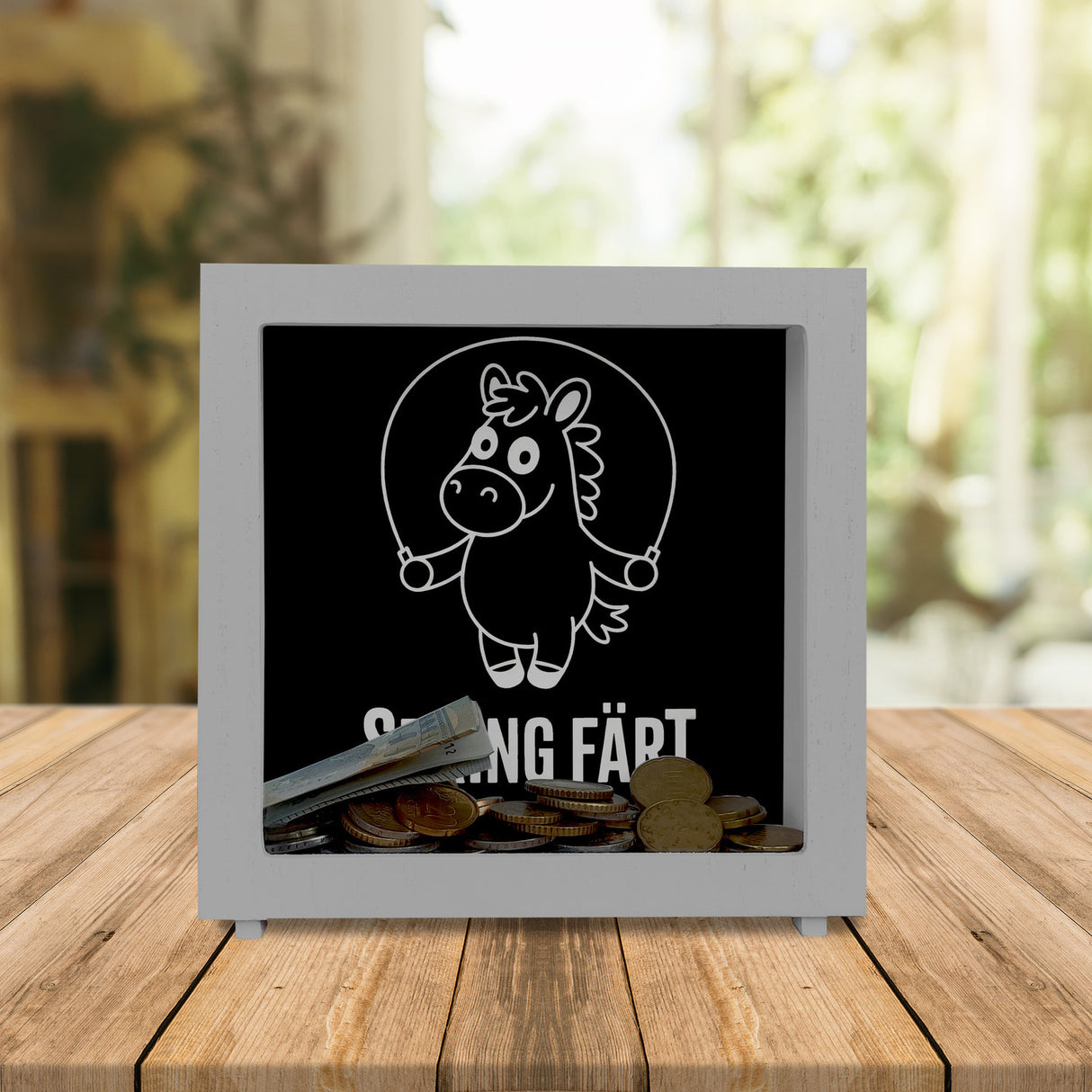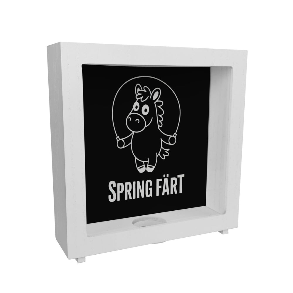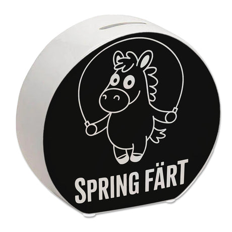 - Diese witzige Spardose zeigt ein cartoonhaftes Pferd mit einem überraschten Gesichtsausdruck, das in die Luft springt. Der schwarze Hintergrund lässt das weiße Pferd besonders gut zur Geltung kommen. Der freche Spruch "SPRING FÄRT" rundet das verspielte Design ab. Ein Hingucker in jedem Kinderzimmer!