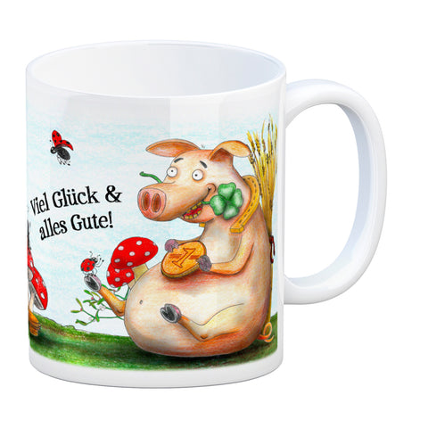 Kaffeebecher mit Glücksschwein Motiv und Spruch: Viel Glück und alles Gute!
