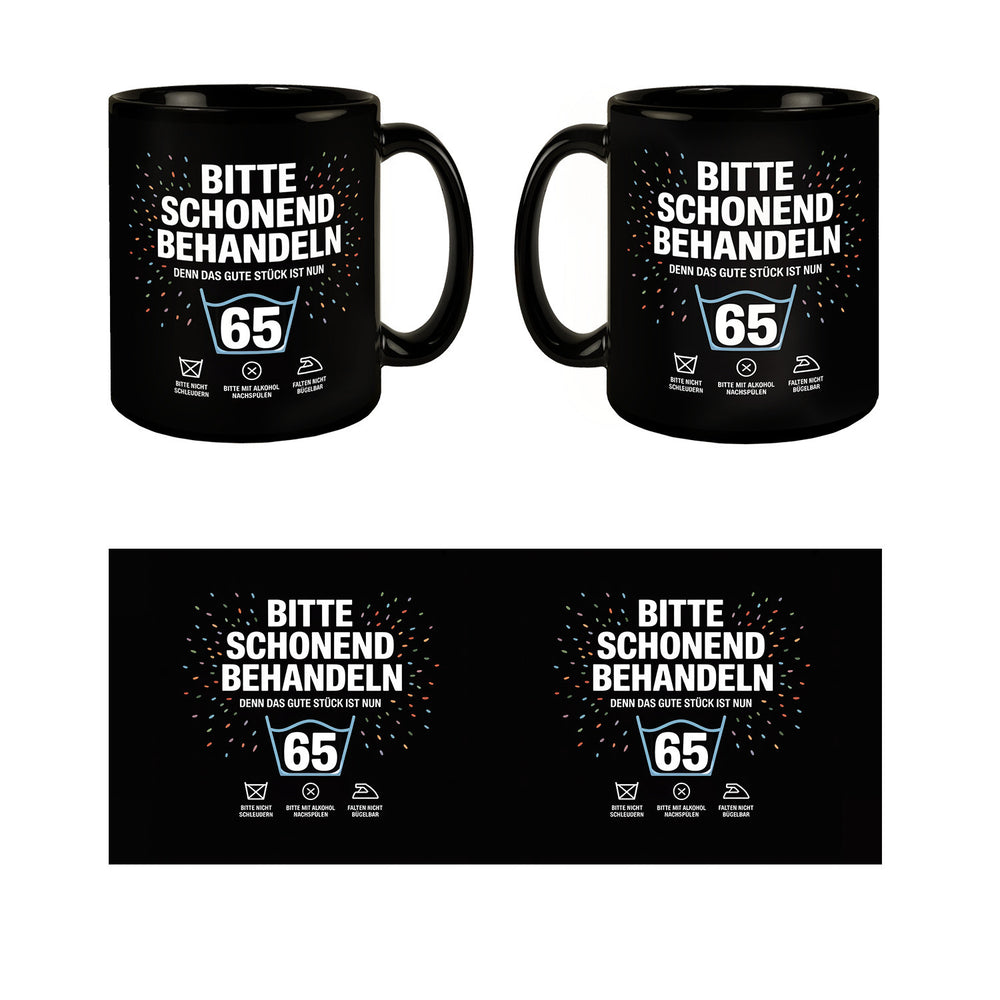 Die Tasse ist ein echter Hingucker: Auf schwarzem Grund prangt in großen weißen Lettern der Spruch "BITTE SCHONEND BEHANDLEN". Umrahmt von einer humorvollen Zahl '65' im blauen Waschmaschinensymbol, verleiht die konfettiartige Verzierung der Tasse Hinweise: Fassungsvermögen: ca. 300ml