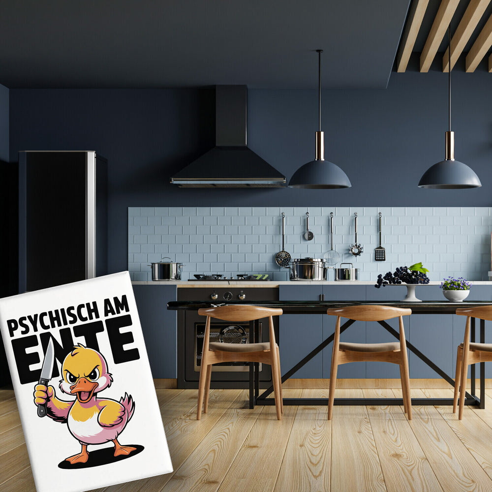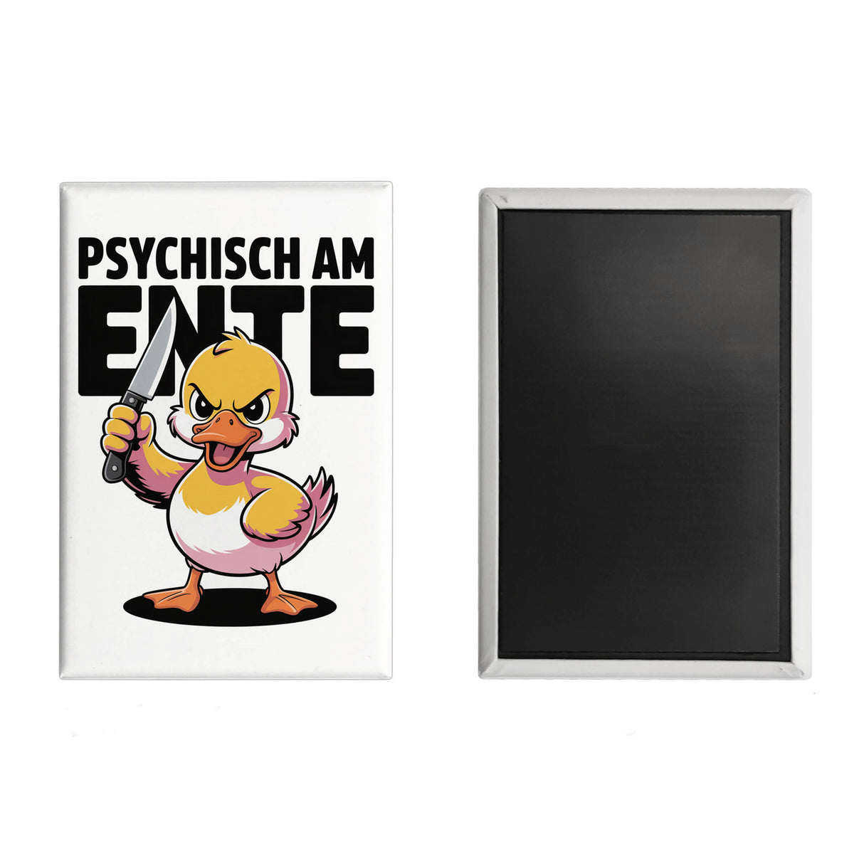 Der Wütende Ente Magnet zeigt eine coole Cartoon-Ente im Kawaii-Stil. Mit silbernem Küchenmesser und einem entschlossenen, wütenden Blick ist sie schwer zu übersehen. Die kräftigen Farben und der auffällige schwarze Text "PSYCHISCH AM ENTE" auf we Hinweise: Größe: ca. 8x5,5 cm