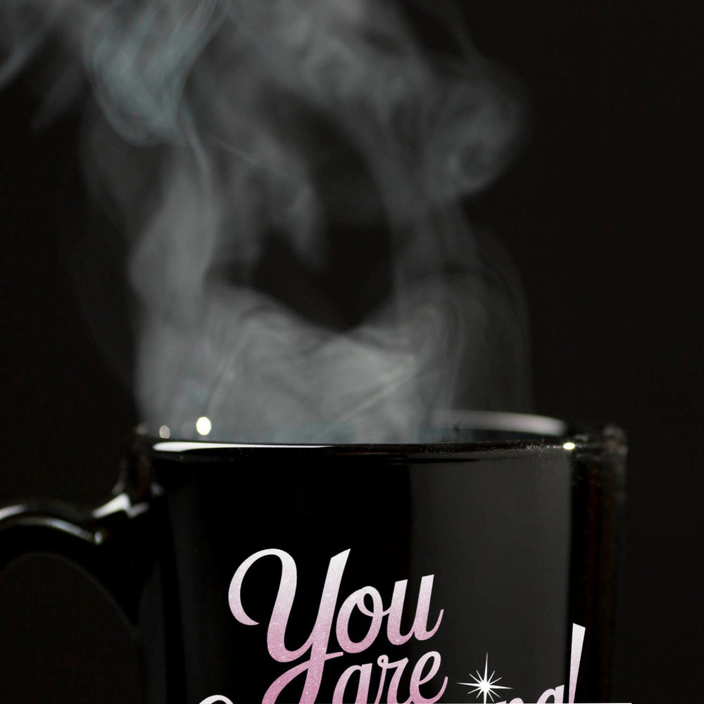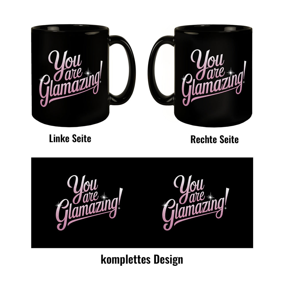 - Diese glamouröse Tasse in elegantem Schwarz bringt Glanz in jeden Raum. Mit dem funkelnden Spruch "You are Glamazing!" in glitzernden, kursive Buchstaben und Sternenmuster ist sie ein echter Hingucker. Das feminine und raffinierte Design verleiht jedem Morgenkaffee oder Teegenuss das gewisse Etwas.