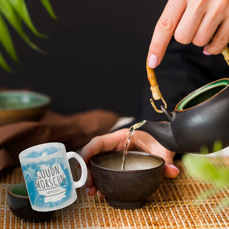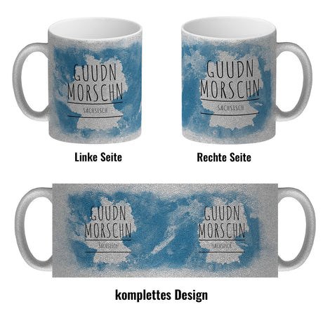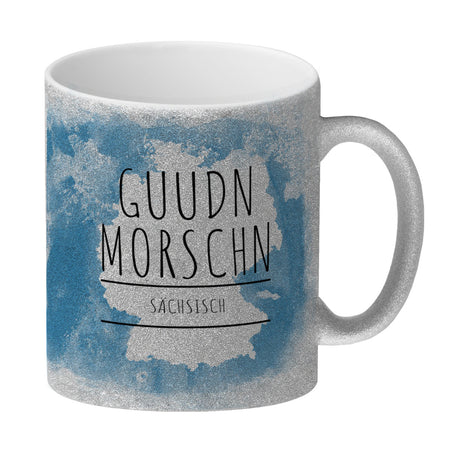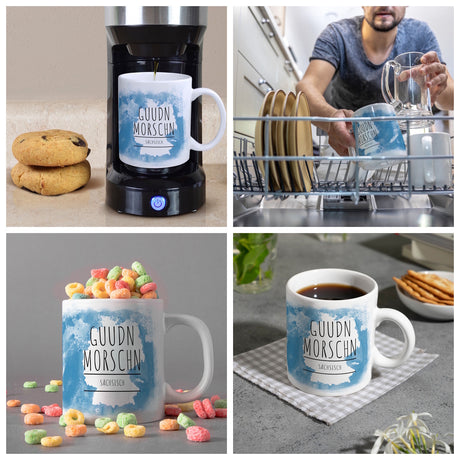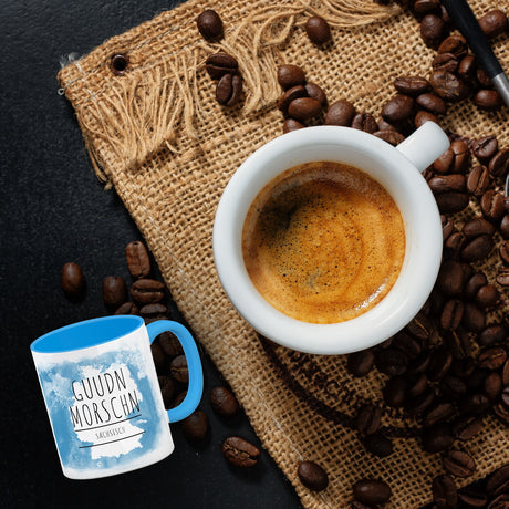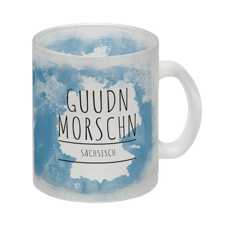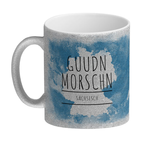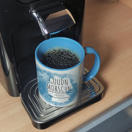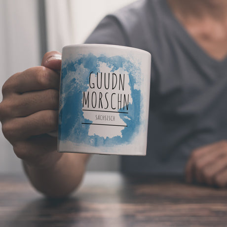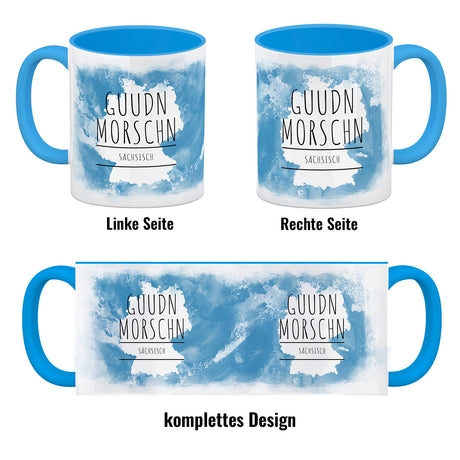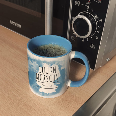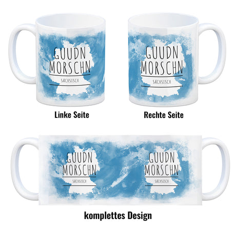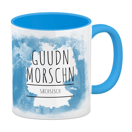 €11,95Grundpreis /Nicht verfügbar Hallo auf Sächsisch Guudn Morschen lustiger Kaffeebecher mit blauem Hintergrund