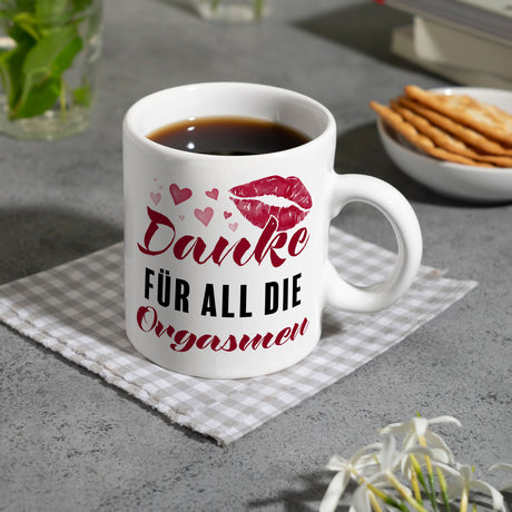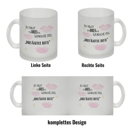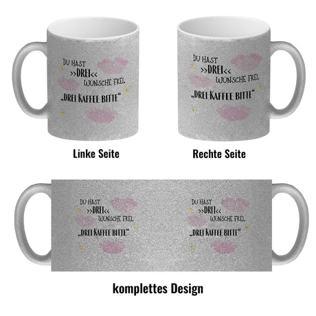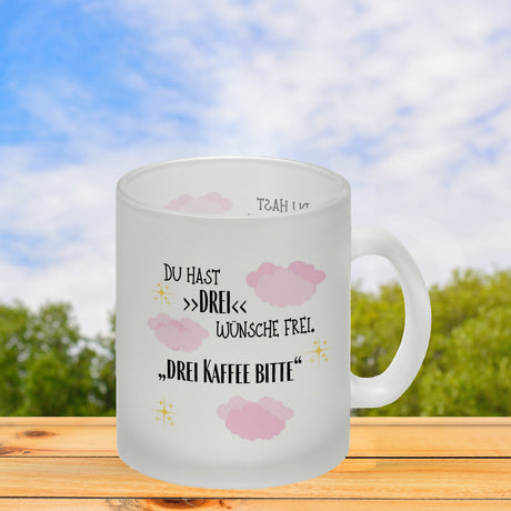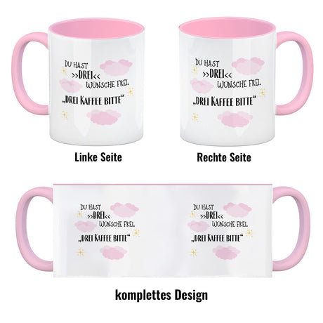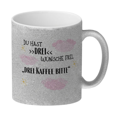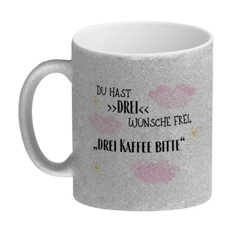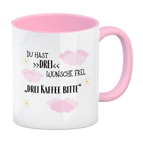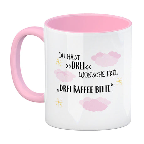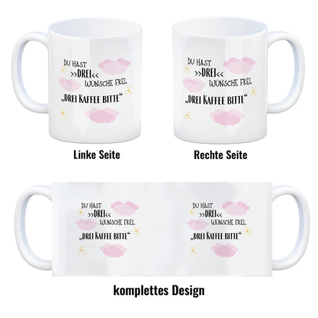 Drei Wünsche Frei Kaffeebecher mit Spruch Drei Kaffee bitte