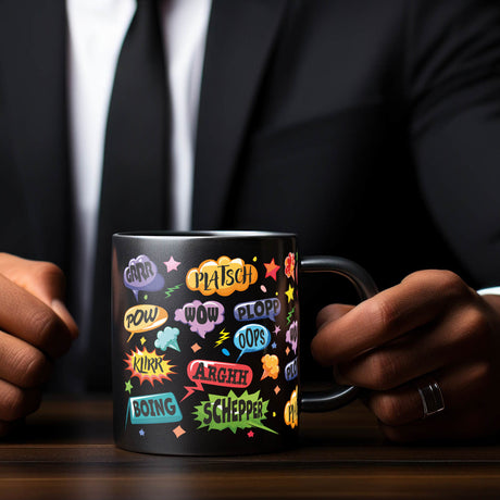 €13,95Grundpreis /Nicht verfügbarAuf LagerComic Tasse in Schwarz mit Spruch: Comic sounds, coffee enthusiasts unite!