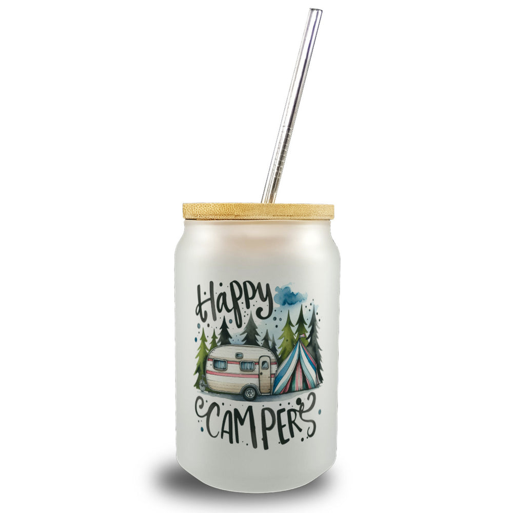 • 1x Happy Campers Wohnwagen Trinkglas mit Bambusdeckel mit Bambusdeckel oder Henkel