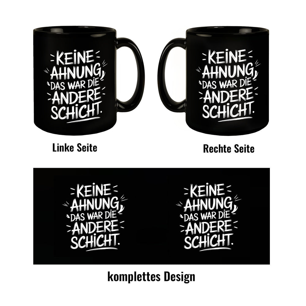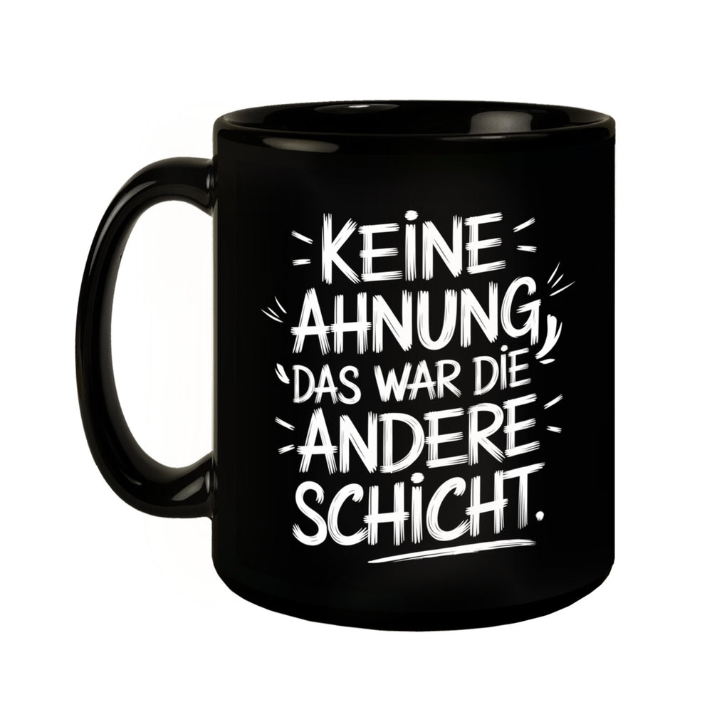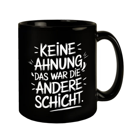 • Diese Kaffeetasse kommt in elegantem Schwarz daher und ist mit einem witzigen Spruch versehen: "KEINE AHNUNG, DAS WAR DIE ANDERE SCHICHT." Der humorvolle Text im handschriftlichen Stil wird von einer passenden Sprechblase ergänzt. Perfekt für jeden, der Humor schätzt und seinen Kaffee mit einem Augenzwinkern genießen will.