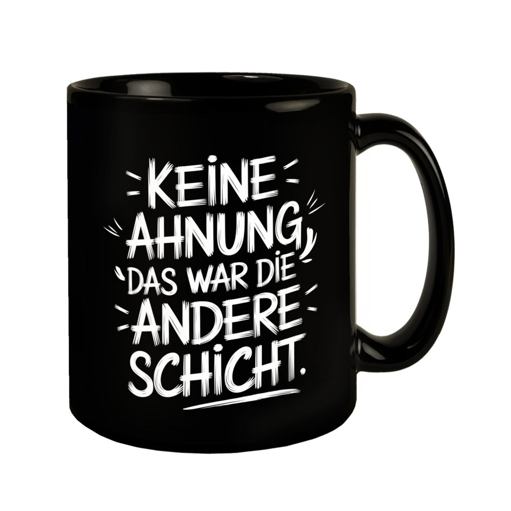 Seien Sie der Star Ihres Büros und bringen Sie Ihre Kollegen zum Schmunzeln mit der charmanten War die andere Schicht -Tasse! Diese elegante, tiefschwarze Kaffeetasse ist nicht nur ein funktionales Accessoire, sondern auch ein Gesprächsthema, das den tristen Büroalltag aufheitert. Mit ihrem humorvollen Spruch „KEINE AHNUNG, DAS WAR DIE ANDERE SCHICHT sorgt sie garantiert für köstliche Erheiterung – perfekt gedruckt im handschriftlichen Stil, abgerundet durch eine freche Sprechblase. Diese Tasse ist mehr als nur ein Behältnis für Ihren Koffein-Kick – sie bietet eine unschlagbare Ausrede für all die kleinen Missgeschicke, die im Büro passieren. Einfach auf die Tasse deuten und mit einem Augenzwinkern die Verantwortung abgeben! Gefertigt aus hochwertiger Keramik, bietet sie mit rund 300 ml ausreichend Platz für Kaffee, Tee oder jede andere Lieblingsgetränk. Zudem ist sie spülmaschinenfest und bewahrt ihre glänzenden Farben, egal wie oft Sie schmunzelnd den Abwasch umgehen.Machen Sie diese Tasse zu Ihrem neuen Lieblingsstück oder verschenken Sie sie an mit-humorvoll begabte Kollegen und Freunde. Ob zum Geburtstag, zum Abschied oder einfach, um jemandem den Tag zu versüßen – diese Tasse ist die perfekte Wahl! Jetzt bestellen und mit einem Lächeln durch den Büroalltag gehen!