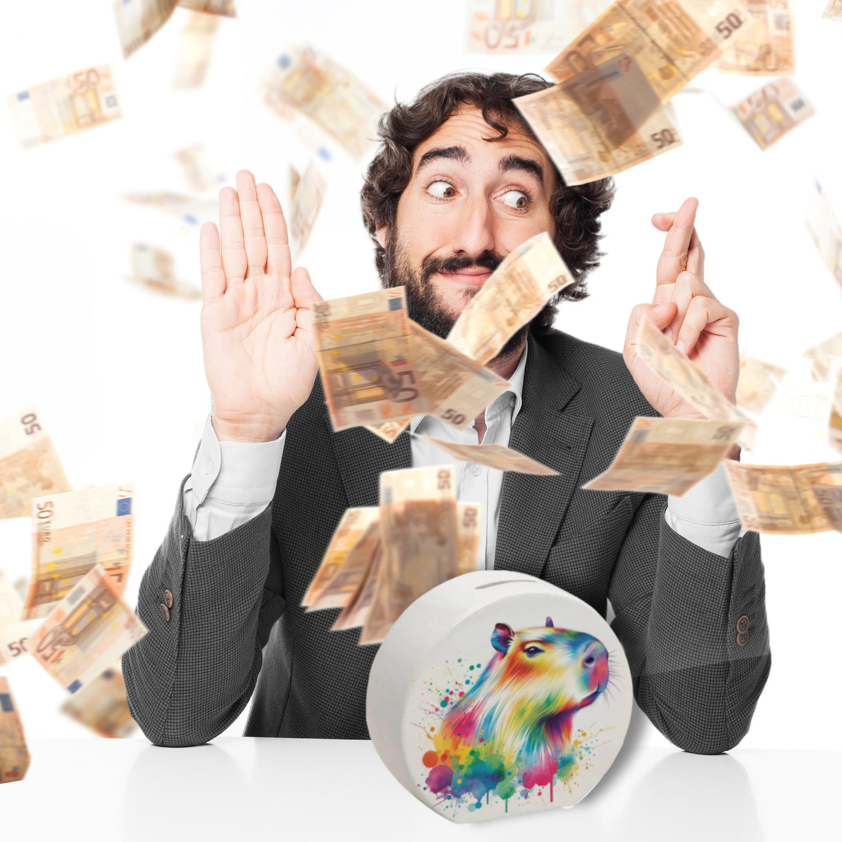 - Wer sagt, Sparen muss grau sein? Die Capybara Aquarell Spardose macht aus Münz-Magie ein farbenfrohes Abenteuer. Dieses mehrfarbige Nagetier, gezeichnet in Aquarellmanier, wacht über dein Geld wie ein kunterbunter Spar-Guru!