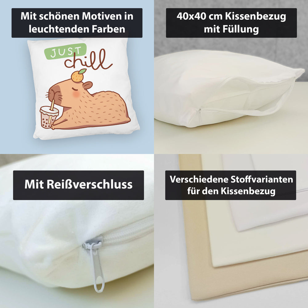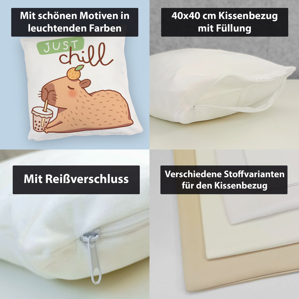 - 1x Capybara mit Bubble Tea Kissen mit Spruch Just Chill in der gewählten Ausführung