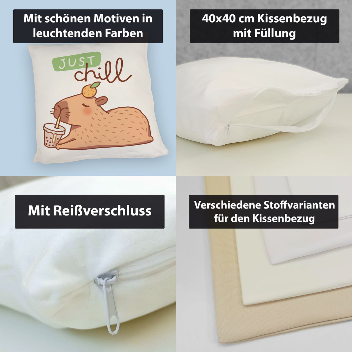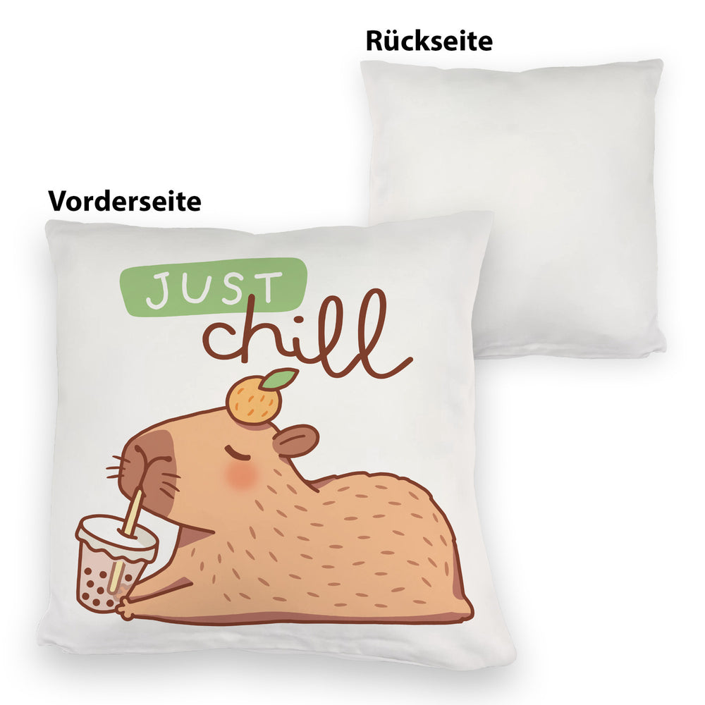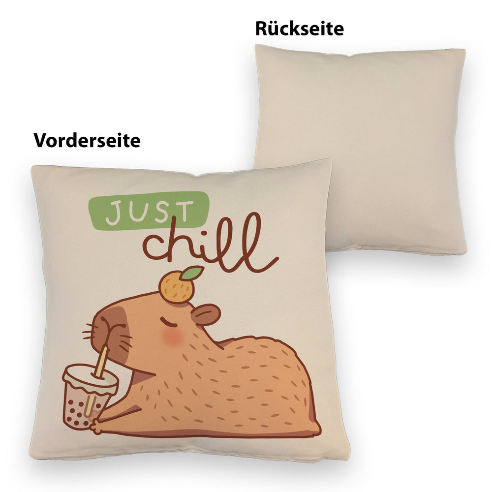 Capybara mit Bubble Tea Kissen mit Spruch Just Chill