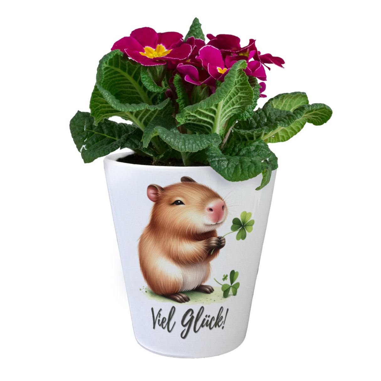 Capybara mit Kleeblatt Blumentopf mit Spruch Viel Glück