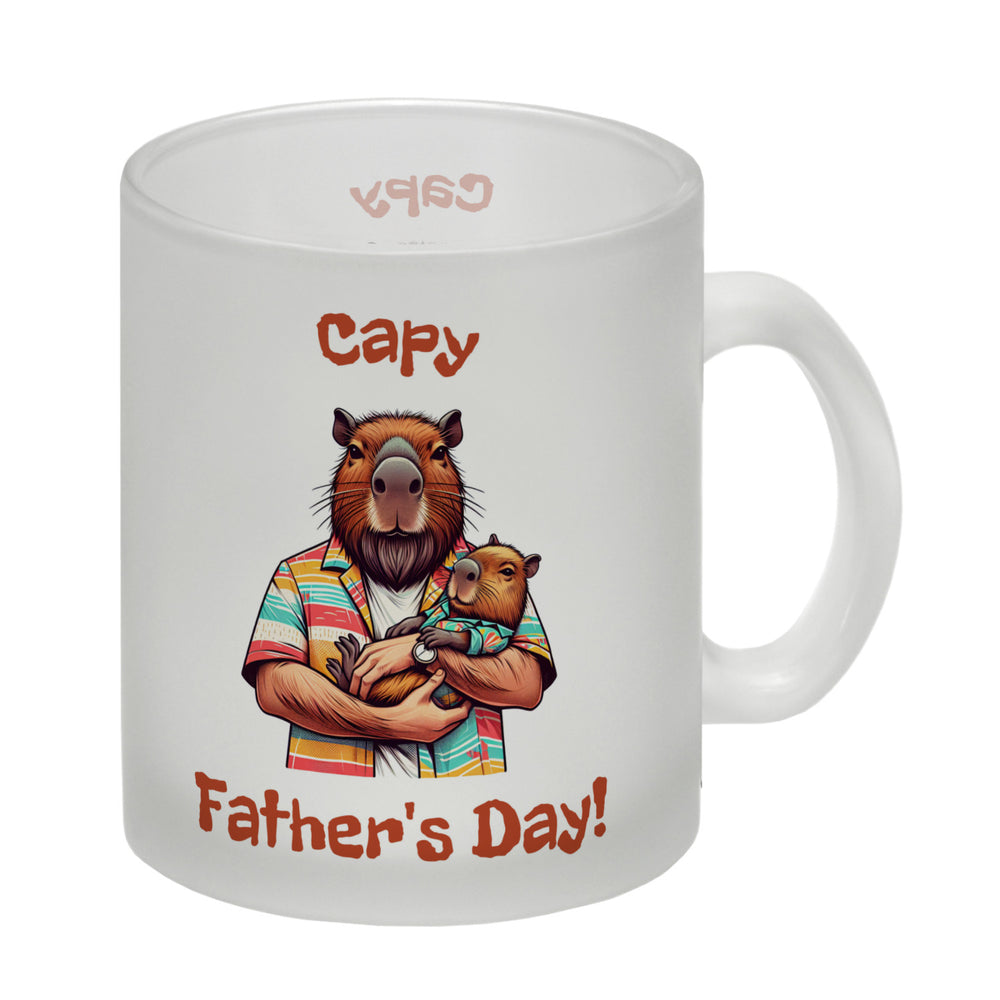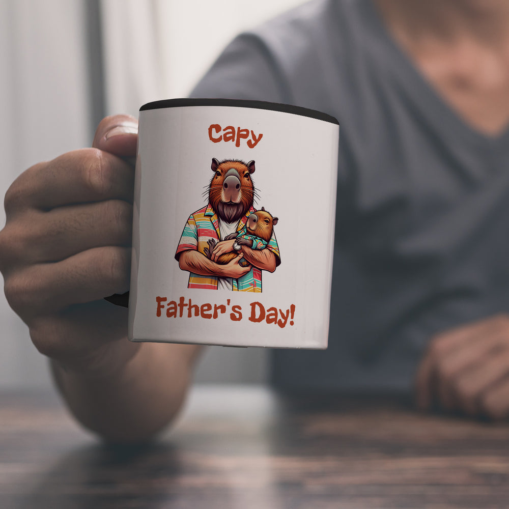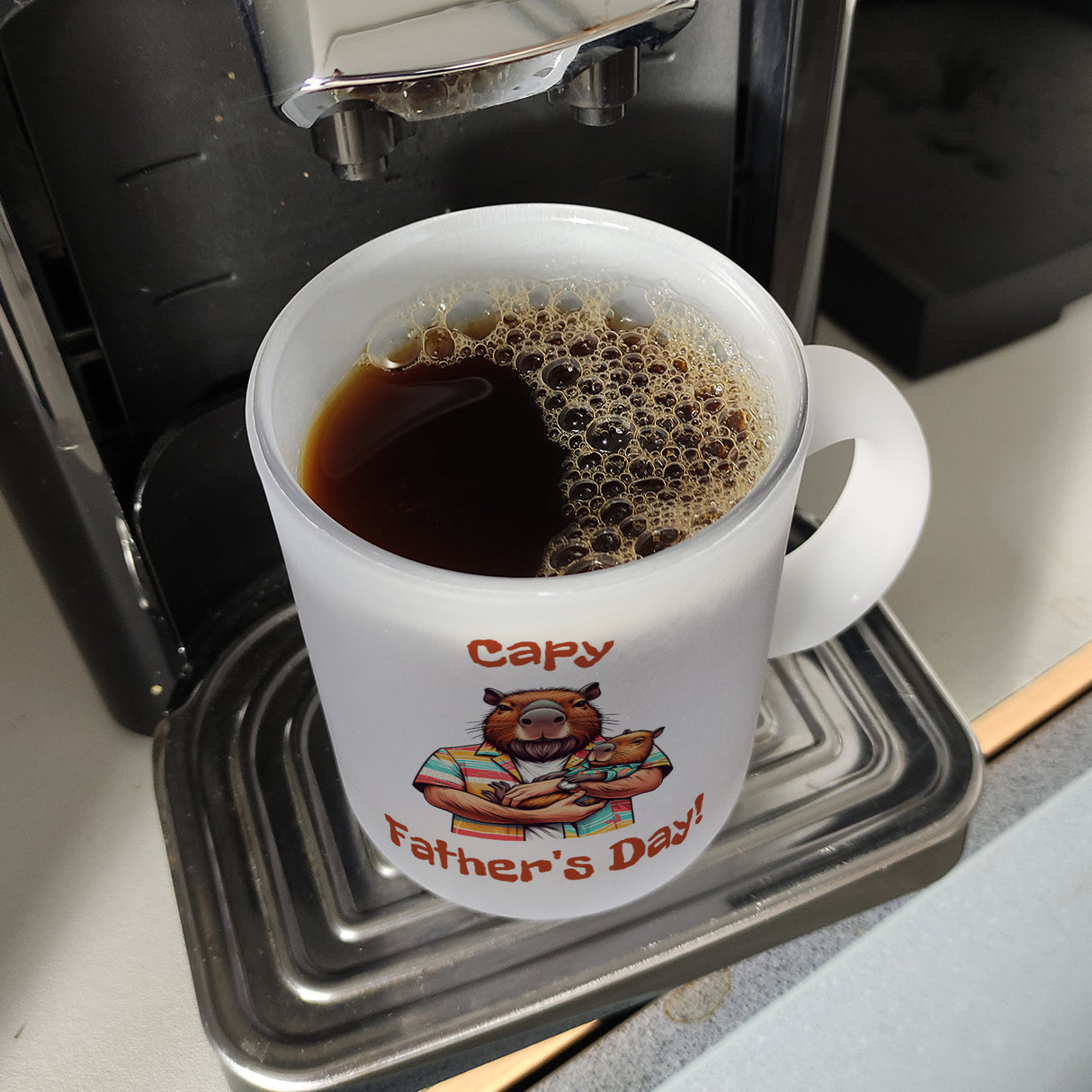 - Say "Happy Capy Father's Day!" jeden Morgen mit unserem Kaffeebecher, der die Vaterliebe auf Capybara-Art feiert. Capy-Daddy in Schale, mit Bart und Mini-Me fest im Arm – für alle Papas, die stilvoll ihren Kaffee schlürfen und dabei ein Herz fürs größte Nagetier haben.