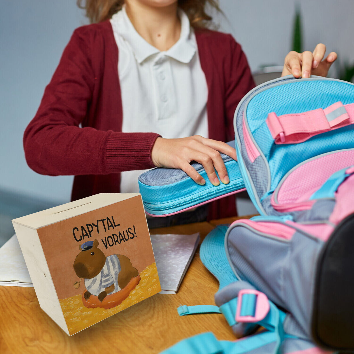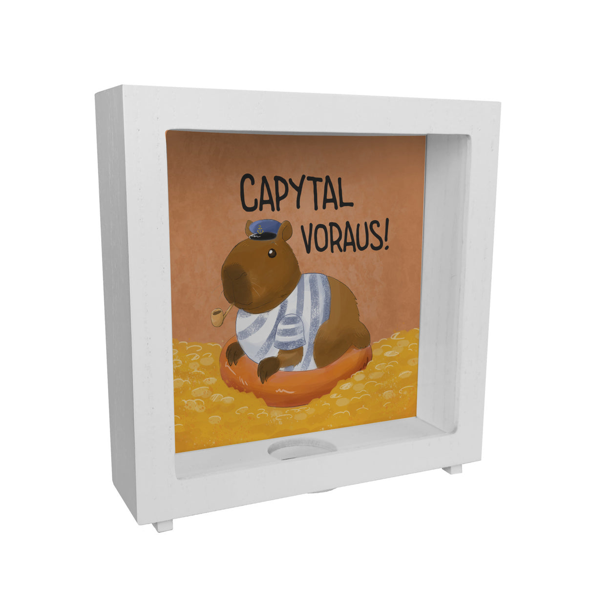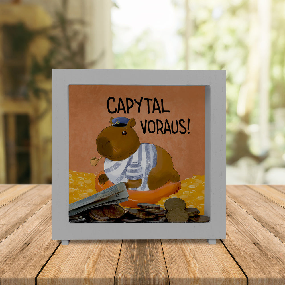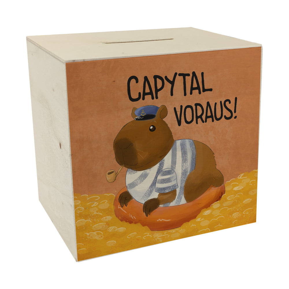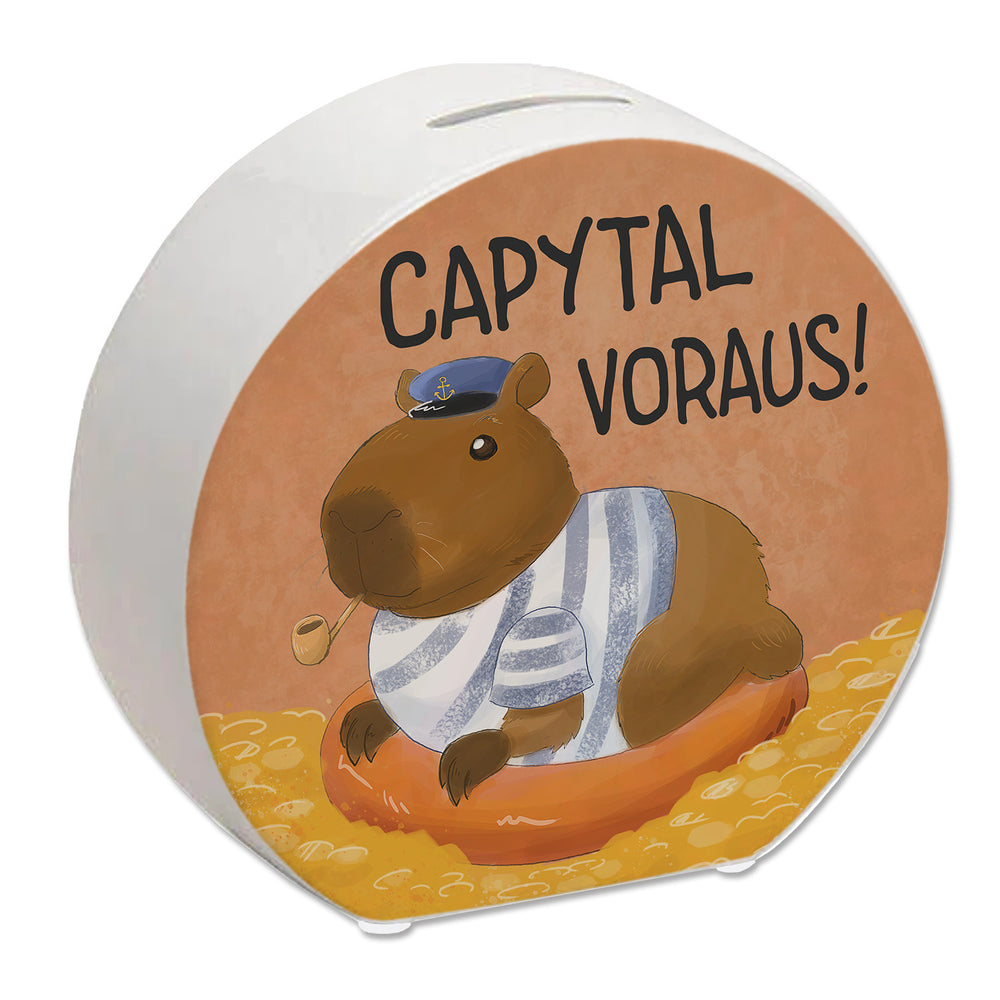 - Arrr, kleine Landratten! Mit der "Capytal voraus" Spardose schippert ihr in die Welt der Schätze! Ein niedliches Capybara, verkleidet als der furchtloseste aller Piraten, bewacht euer Geld in einem Schlauchboot voller Münzen. Dieser pelzige Freund lehrt euch das A und O des Sparens!