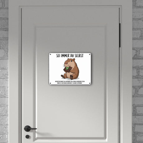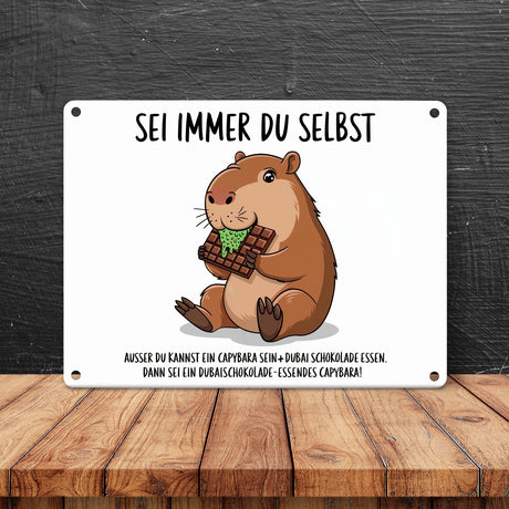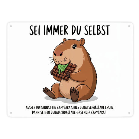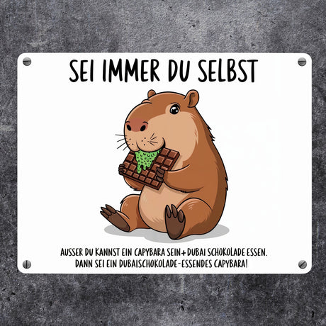 Ab €14,95Grundpreis /Nicht verfügbarAuf LagerCapybara frisst Dubai-Schokolade Metallschild in 15x20 cm - Sei immer du selbst