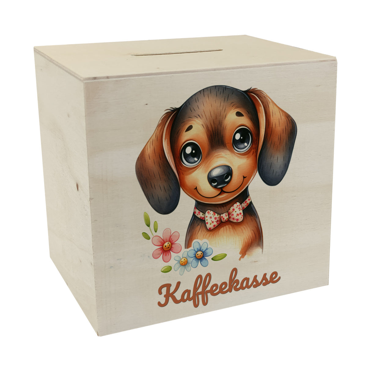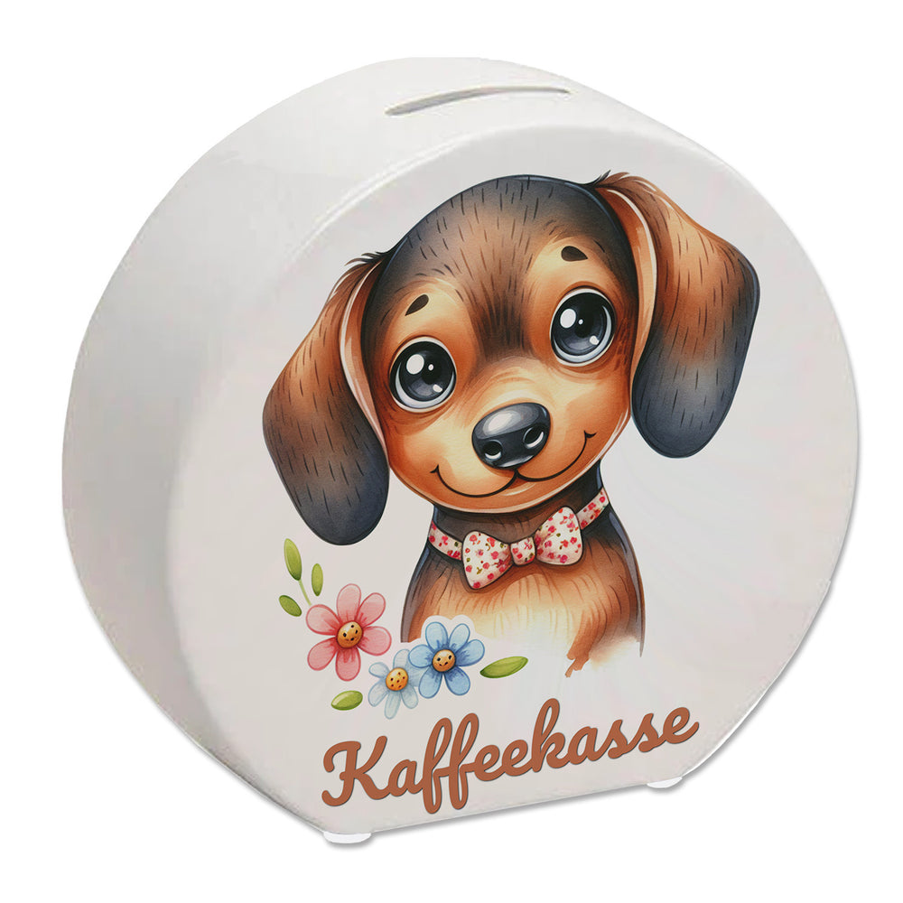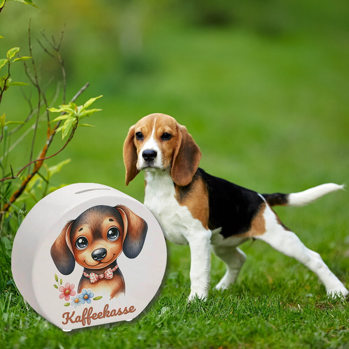 - 1x Dackel mit Schleife Spardose mit Spruch Kaffeekasse in der gewählten Ausführung