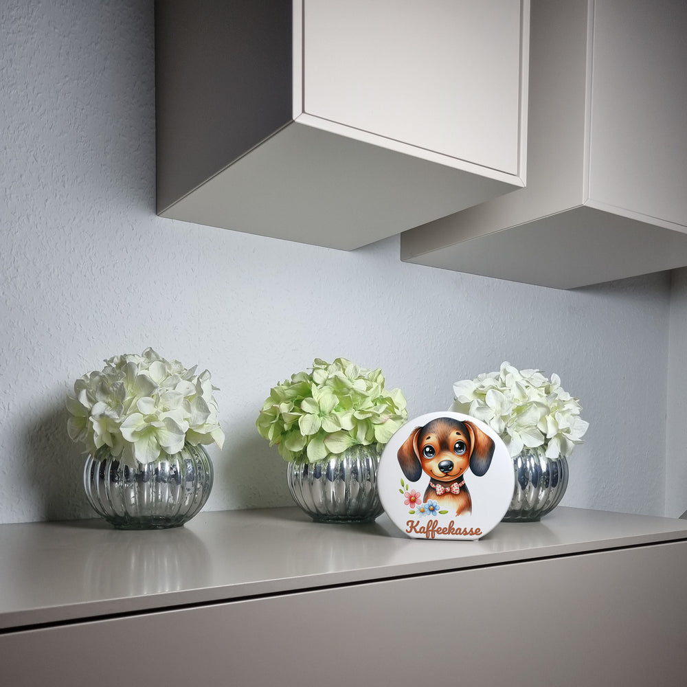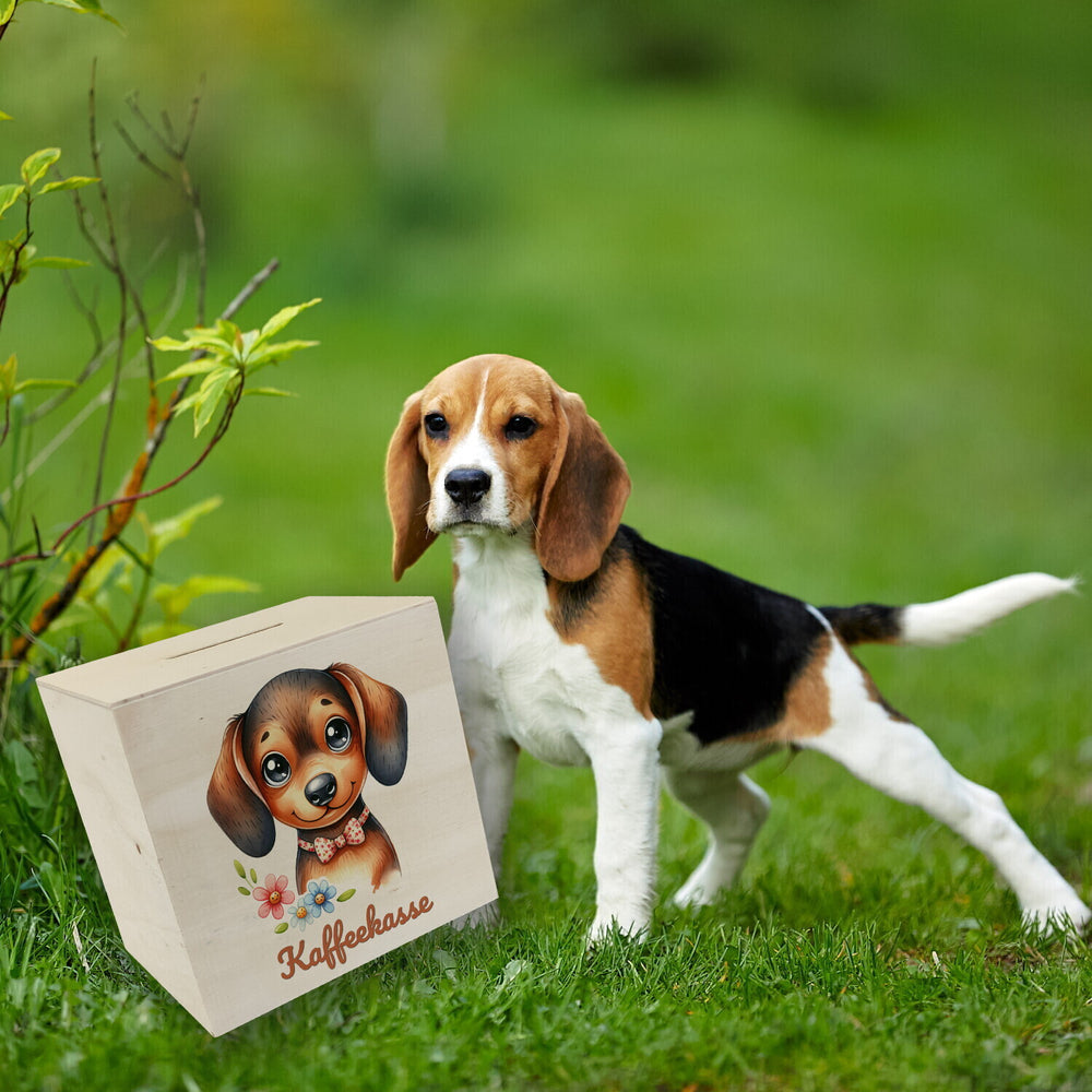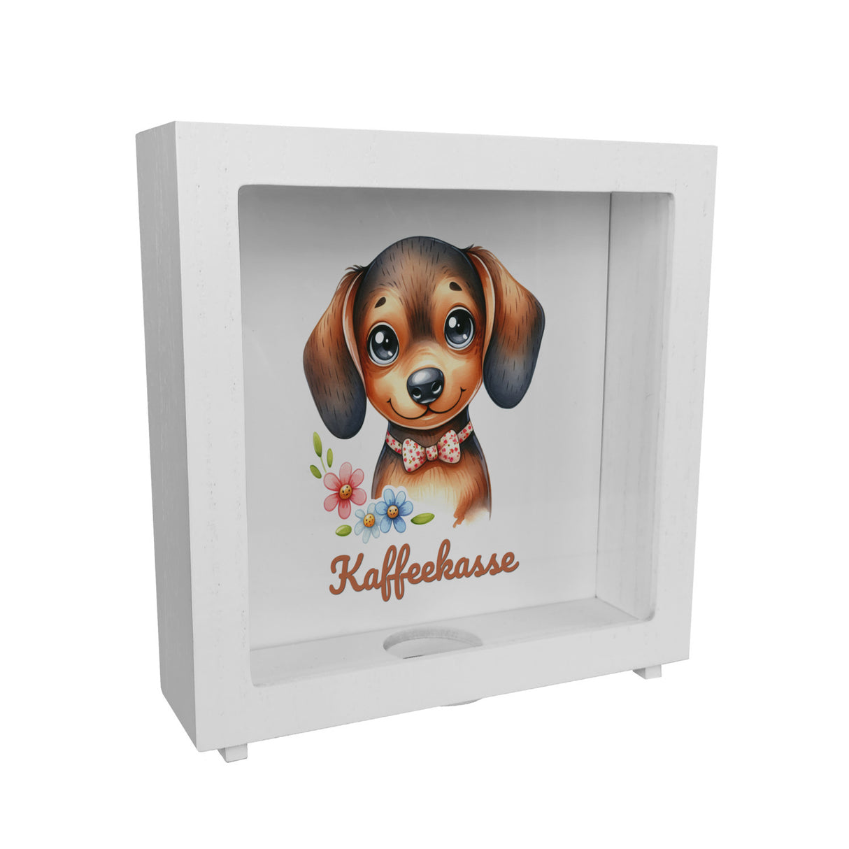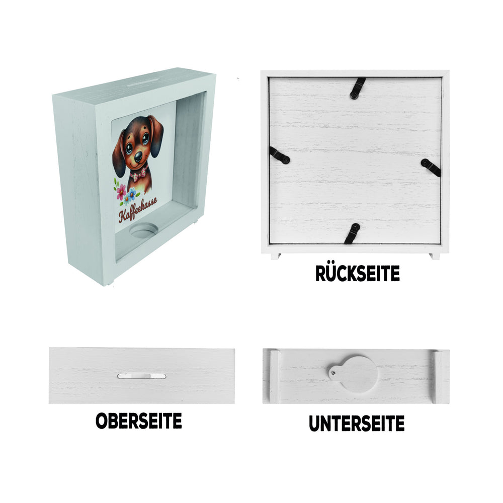 - 1x Dackel mit Schleife Spardose mit Spruch Kaffeekasse in der gewählten Ausführung