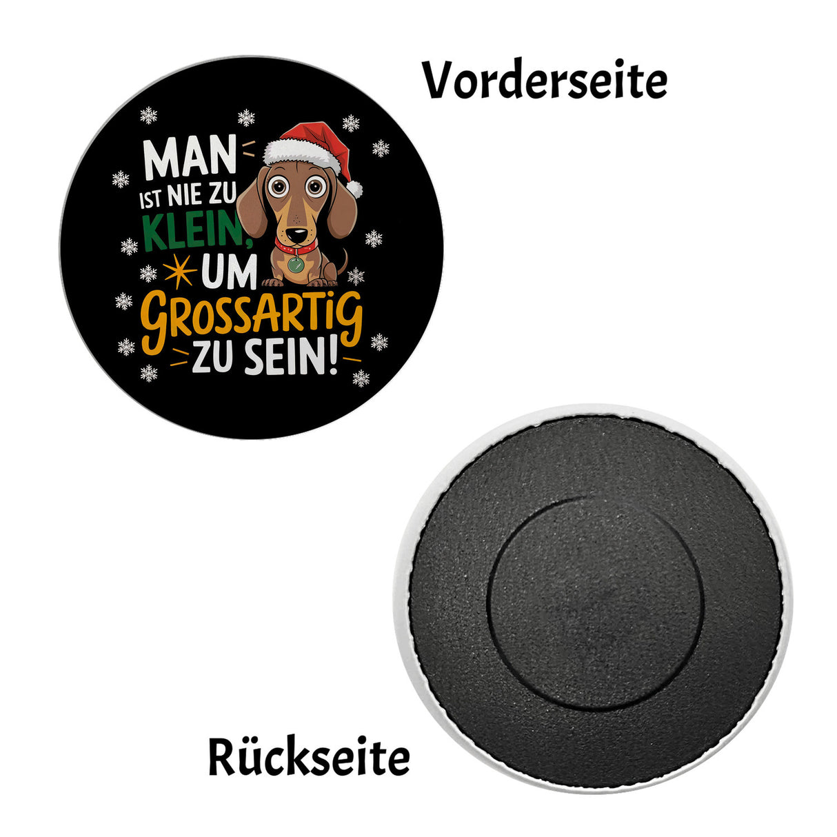 - Rund, fröhlich und voller Charme – dieser Dackel-Magnet bringt dir Weihnachtsfreude an den Kühlschrank! Mit ausdrucksstarken Augen, einer festlichen roten Mütze und einem kecken Halsband ist dieser kleine Vierbeiner ein echter Hingucker. Man ist nie zu klein, um GROSSARTIG zu sein, genau wie dieser kleine Star!