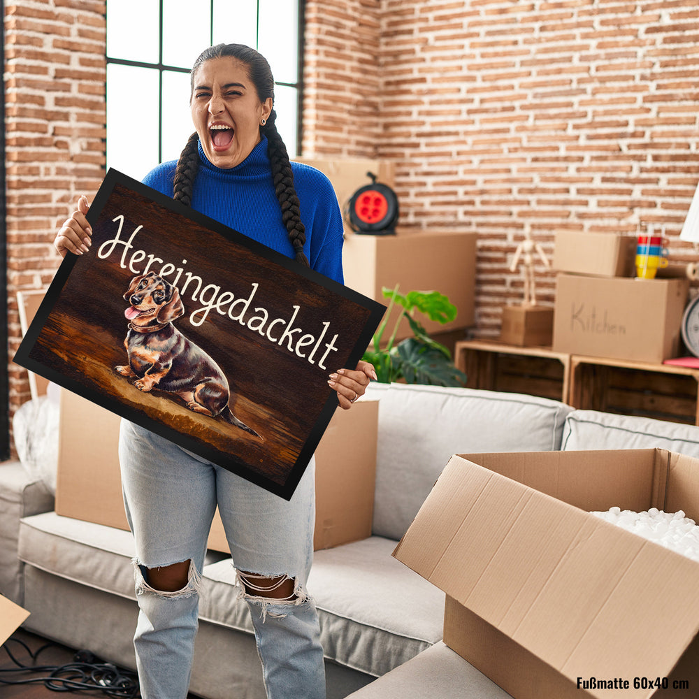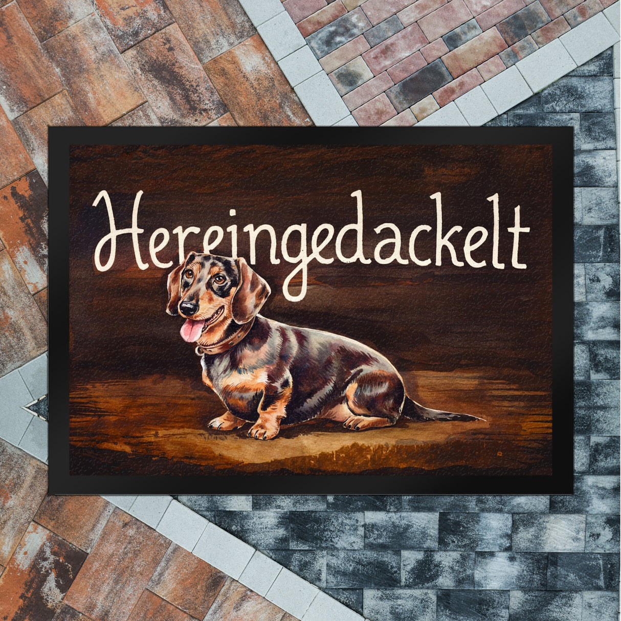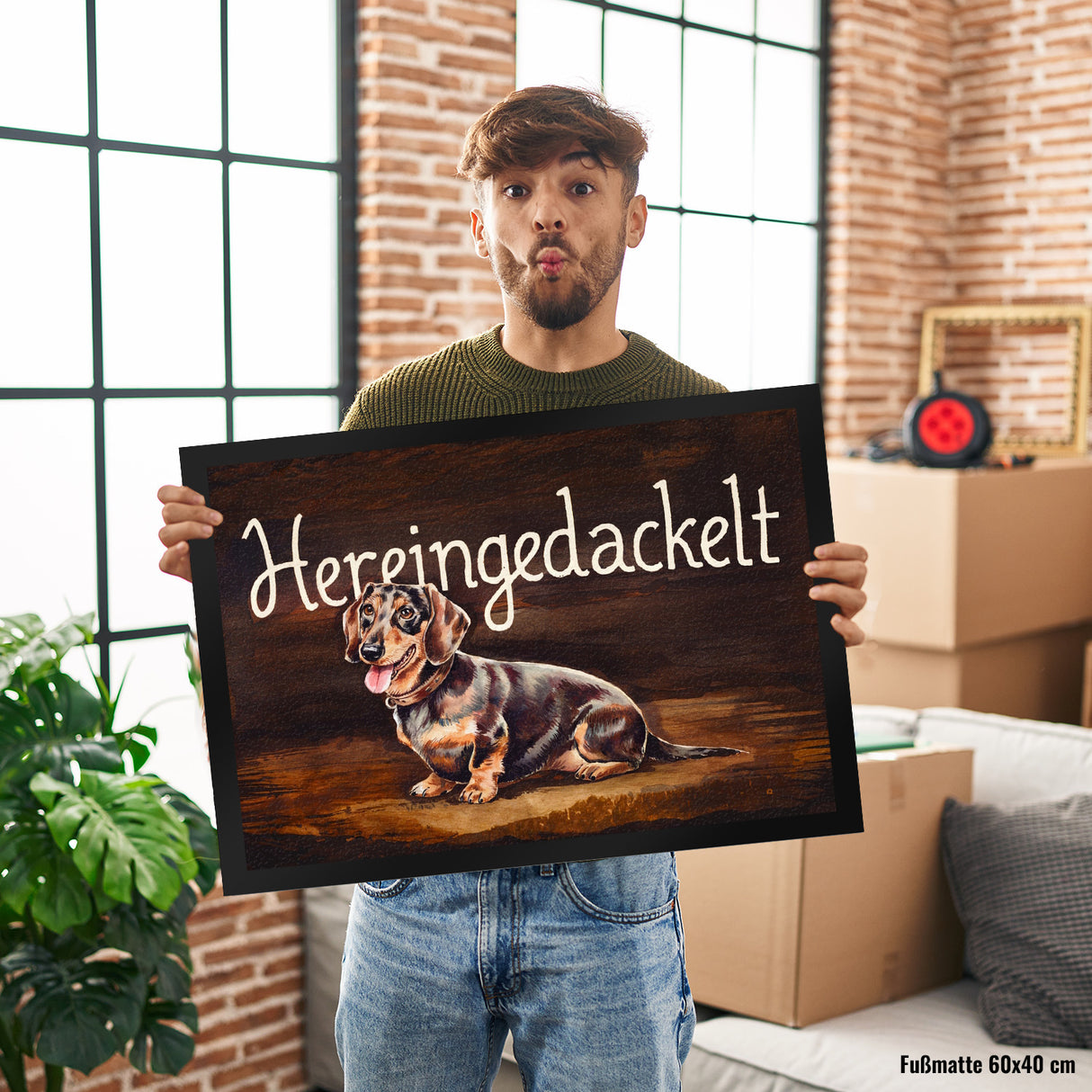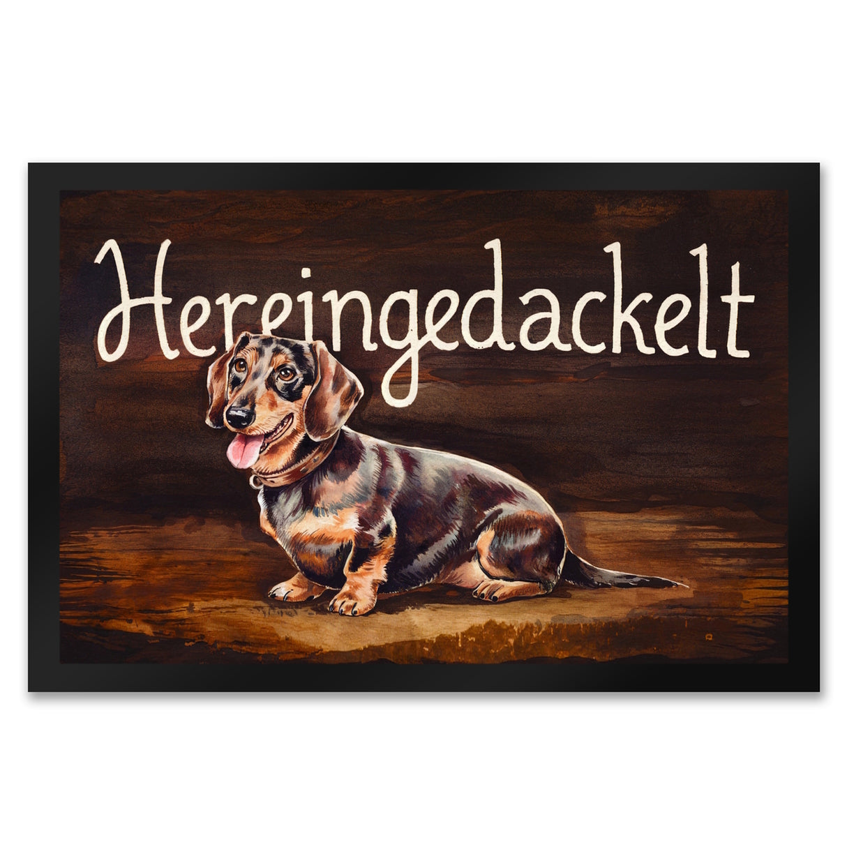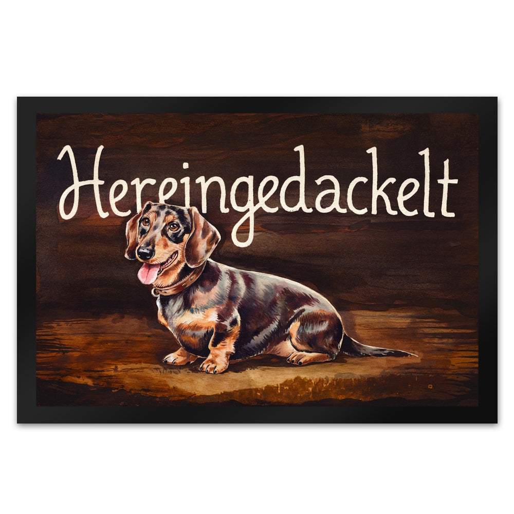 - Willkommen bei der lustigen Welt der Dackel! Diese Fußmatte ist der perfekte Hingucker für Ihr Zuhause. Mit einem niedlichen Dackel, der frech seine Zunge rausstreckt und dem charmanten Spruch "Hereingedackelt" lädt sie Gäste mit einem Augenzwinkern ein.