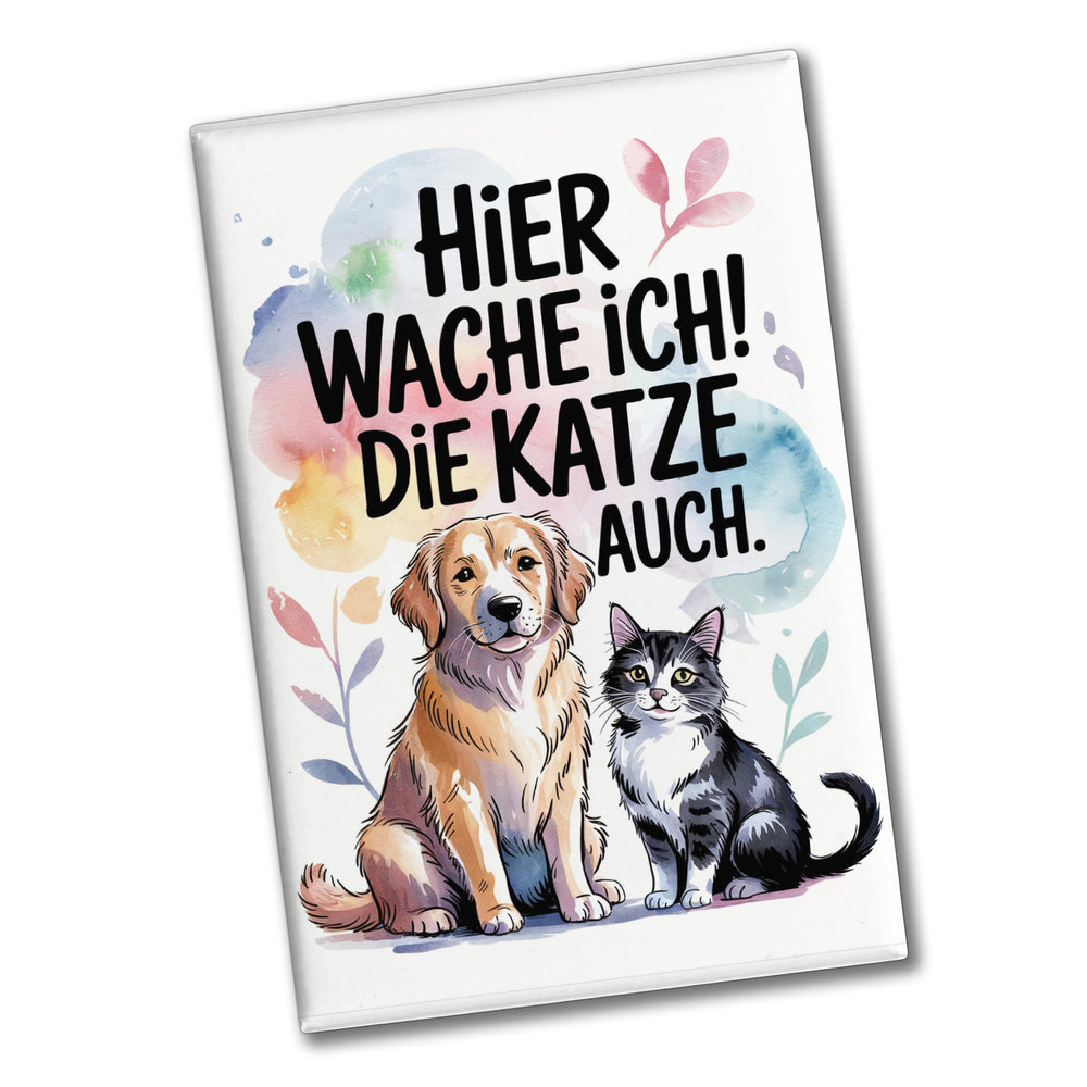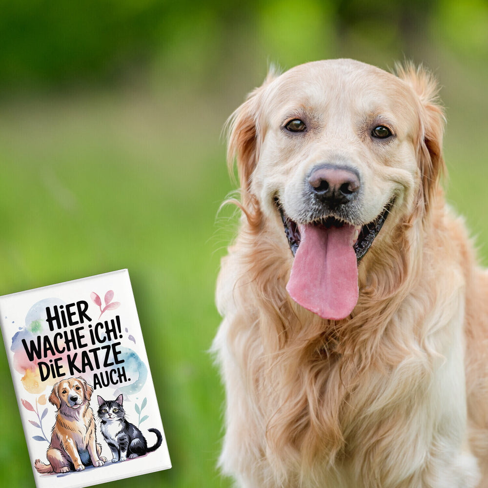 Der rechteckige Magnet zeigt ein bezauberndes Hund- und Katzenmotiv in einem farbenfrohen, aquarellartigen Design. Auf dem weißen Hintergrund befinden sich humorvolle Worte in Großbuchstaben: "Hier wache ich! Die Katze auch." Der Golden Retriever Hinweise: Größe: ca. 8x5,5 cm
