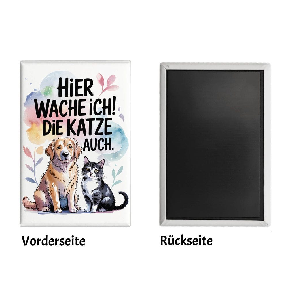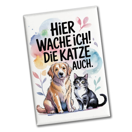 - Der rechteckige Magnet zeigt ein bezauberndes Hund- und Katzenmotiv in einem farbenfrohen, aquarellartigen Design. Auf dem weißen Hintergrund befinden sich humorvolle Worte in Großbuchstaben: "Hier wache ich! Die Katze auch." Der Golden Retriever mit braunem Fell und die neugierige schwarz-weiße Katze sorgen für ein verspieltes und künstlerisches Flair.