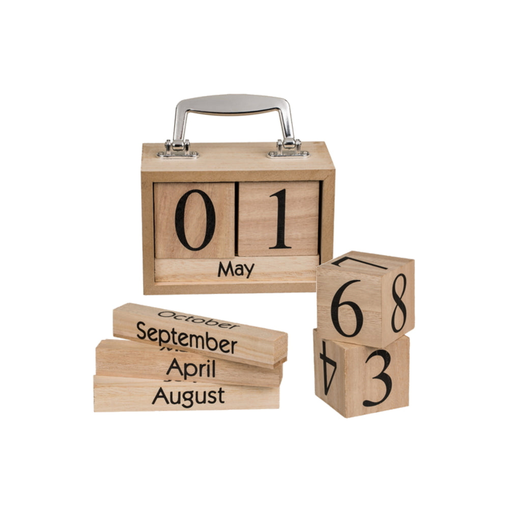 - Lieferumfang: 1x Ewiger Kalender Dekoartikel bestehend aus 1x Holz Koffer, 2x Zahlenklötze und 3x Monatsklötze.