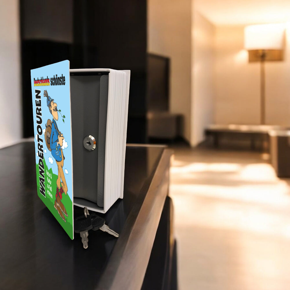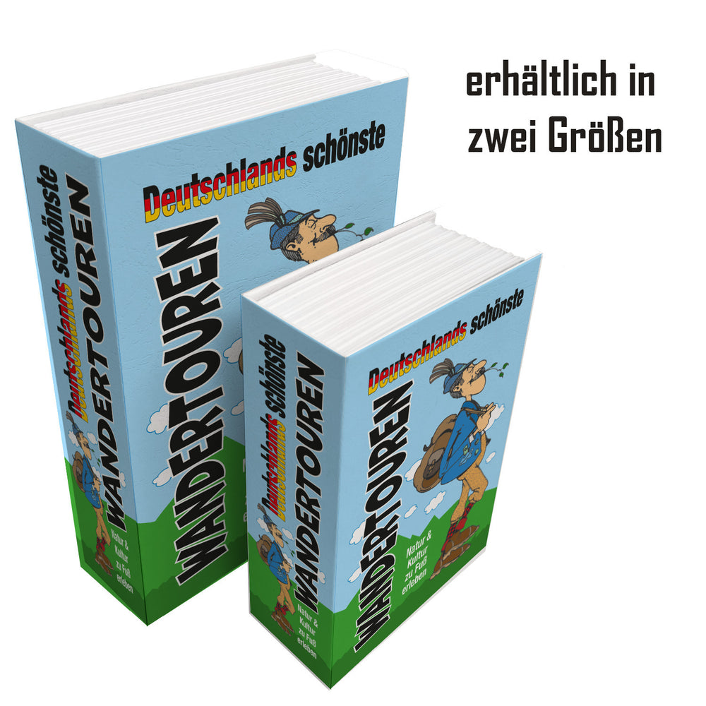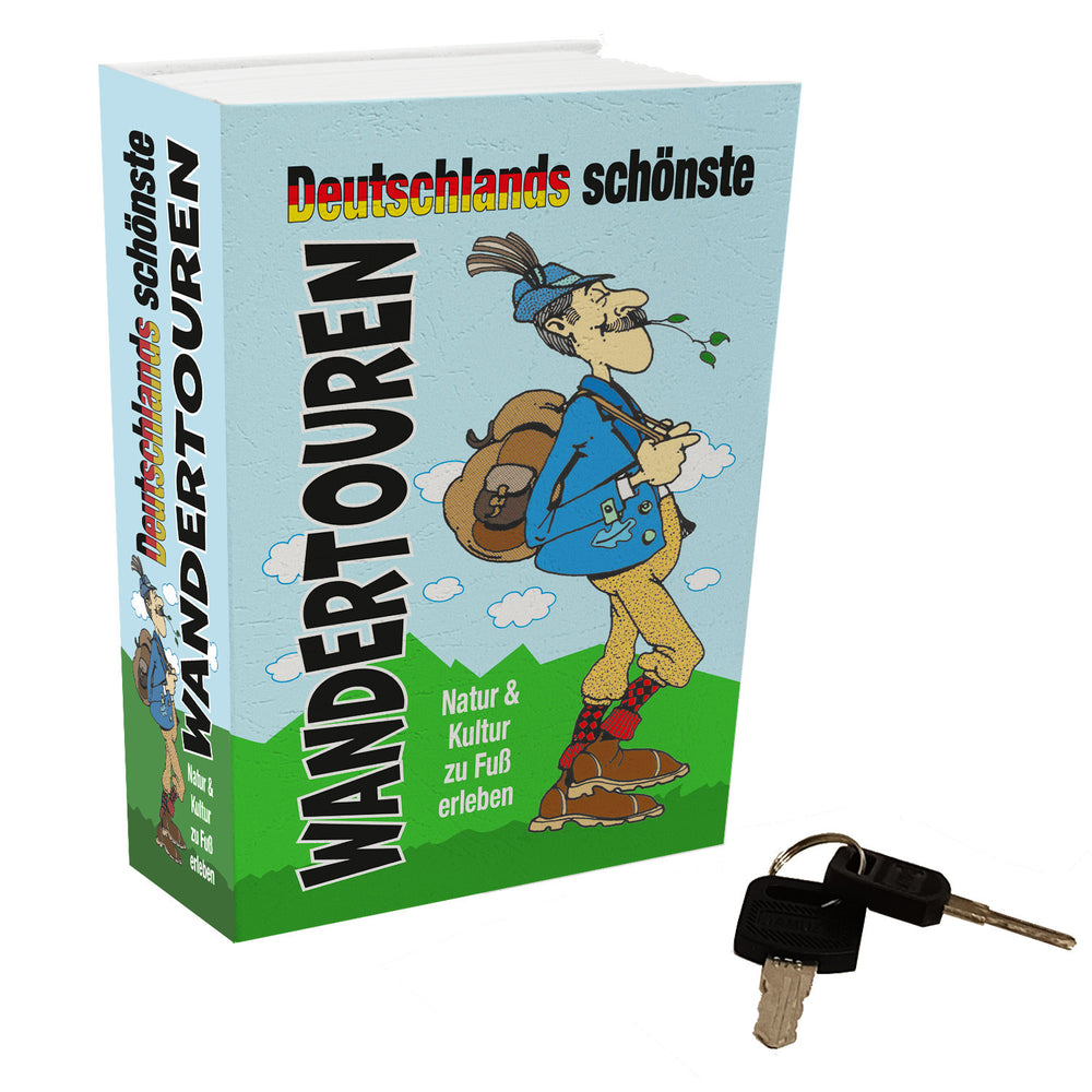 Bringen Sie die Wanderlust in Ihr Zuhause mit unserem einzigartigen Deutschlands schönste Wandertouren erleben Booksafe! Mit seinen fröhlichen Illustrationen eines Wandersmanns und dem charmanten Spruch „Natur und Kultur zu Fuß erleben“ sorgt dieser Booksafe garantiert für ein Schmunzeln. Auf den ersten Blick ein gewöhnlicher Reiseführer, aber im Inneren verbirgt sich ein cleveres Versteck für Ihre wertvollen Schätze – ob Bargeld, Schmuck oder sogar geheime Keksvorräte!Dieser originelle Booksafe, erhältlich in den Größen 12x18 cm und 15,5x24 cm, ist perfekt für Abenteurer, die das Außergewöhnliche schätzen. Seine humorvolle Gestaltung bringt nicht nur den Zauber der Natur ins Wohnzimmer, sondern zeigt auch, dass Bücherregale alles andere als langweilig sein müssen. Ideal als Hingucker, sorgt er für Gesprächsstoff, wenn Freunde oder Familie zu Besuch sind.Sind Sie auf der Suche nach einem kreativen Geschenk? Der Booksafe ist ideal für Geburtstage oder Jubiläen und begeistert alle, die eine Spur Abenteuer in ihrem Leben lieben. Schenken Sie Freude und Sicherheit in einem – und das mit einem Augenzwinkern! Verwandeln Sie Ihr Bücherregal in eine Schatzkammer und bringen Sie ein Stück Natur direkt nach Hause. Jetzt zugreifen und einen Hauch von Wanderabenteuer erleben!