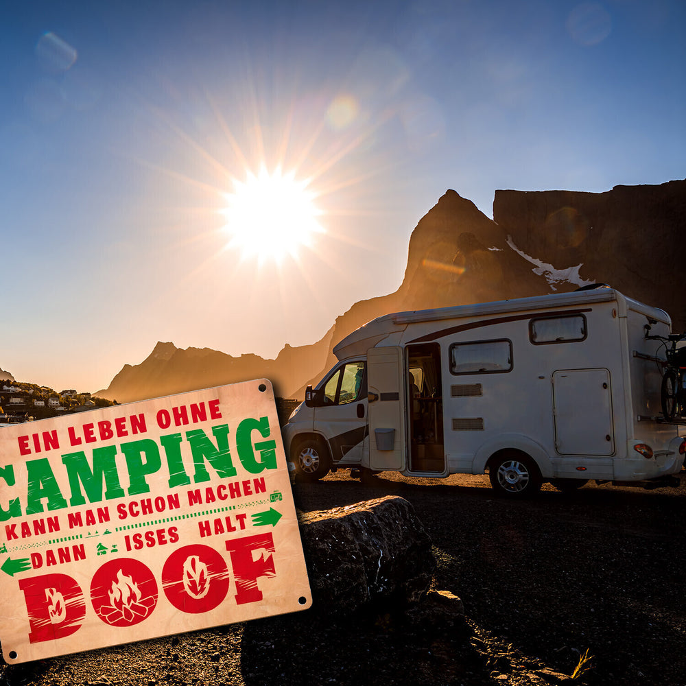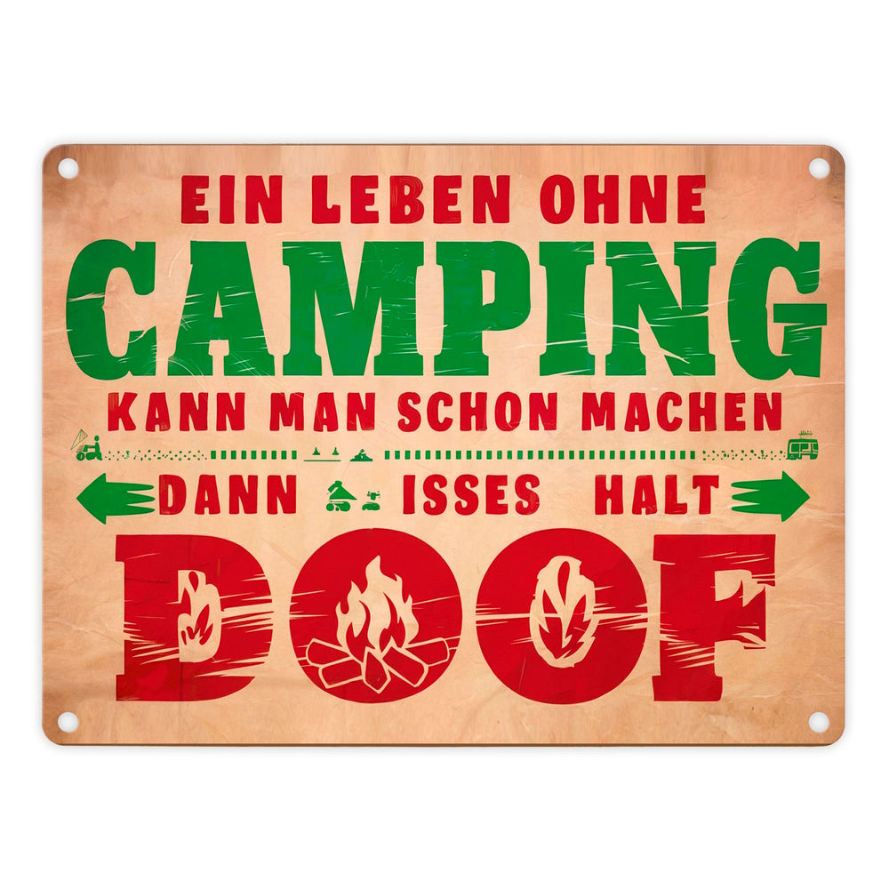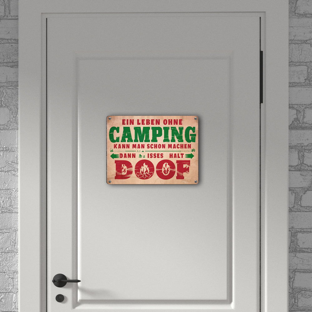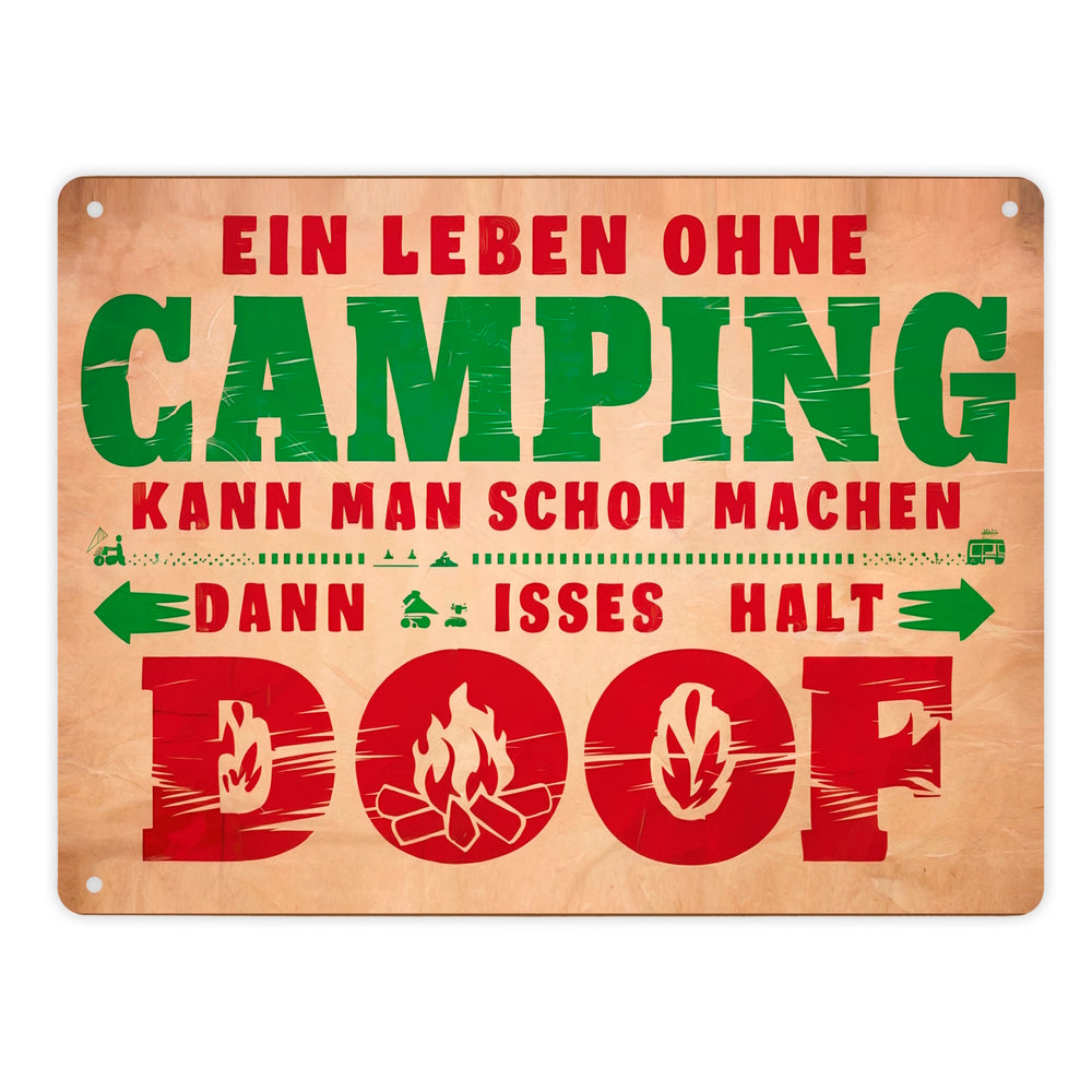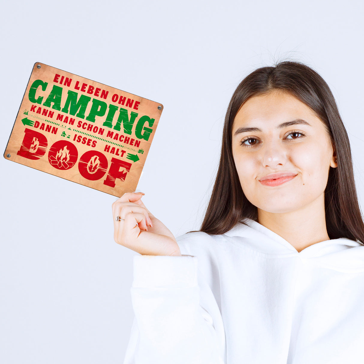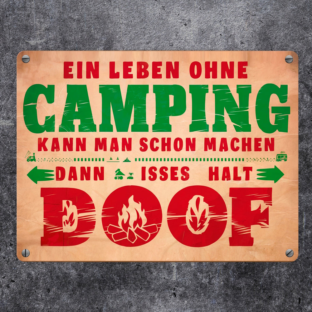 - Camping-Fans aufgepasst! Hier kommt das Metallschild "Ein Leben ohne Camping Doof". Dieses witzige Plakat bringt jeden Camper zum Schmunzeln. Mit fettem grünen Text und rustikalem Hintergrund darf es in keinem Wohnwagen fehlen!