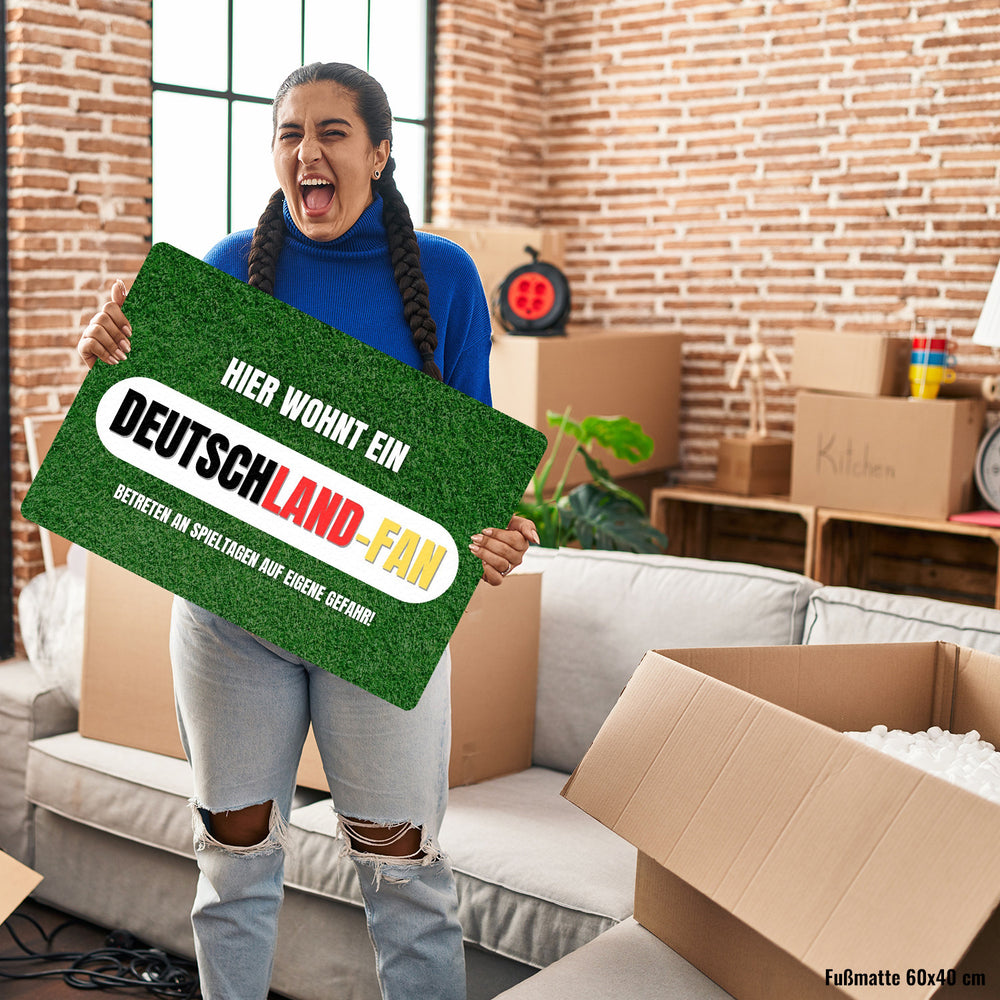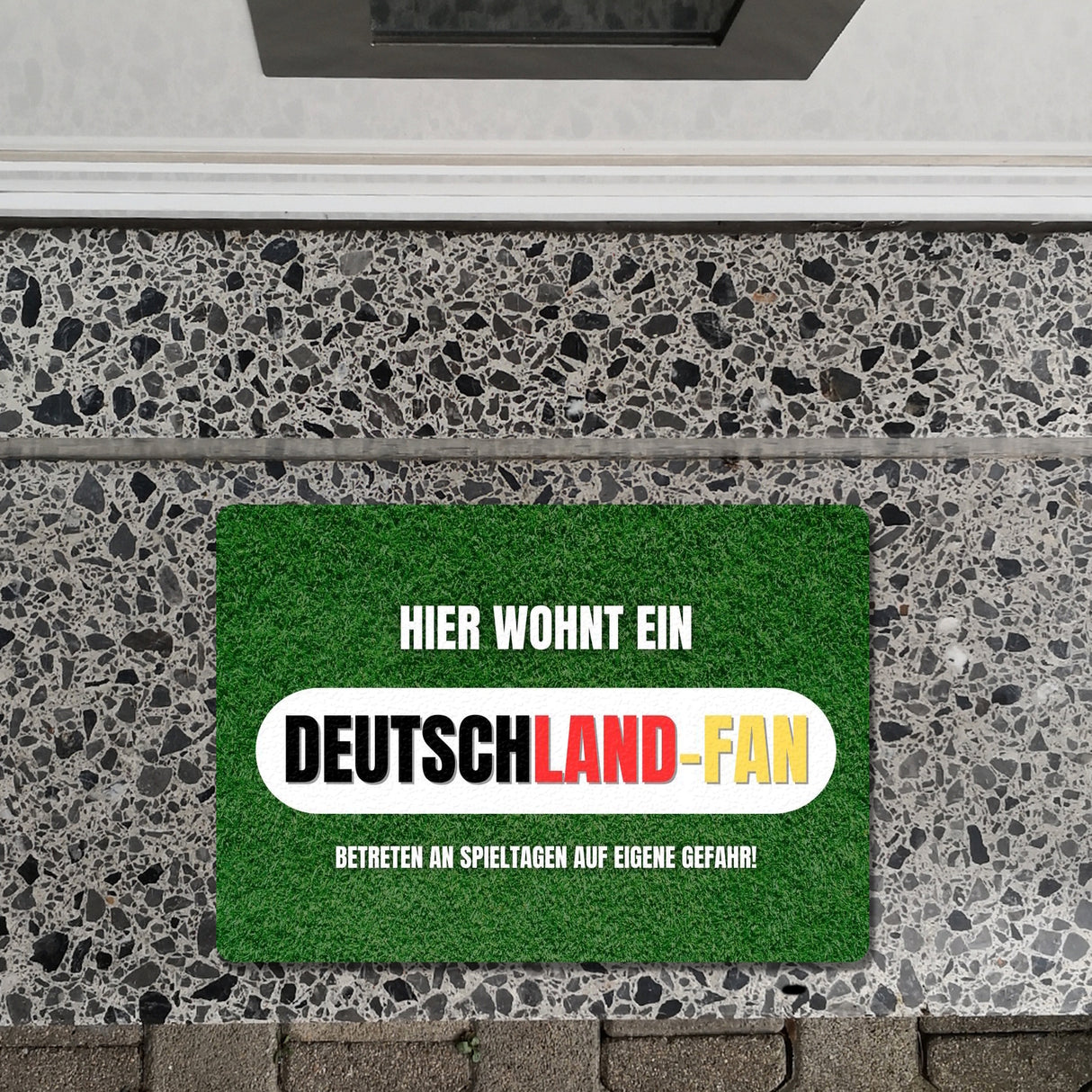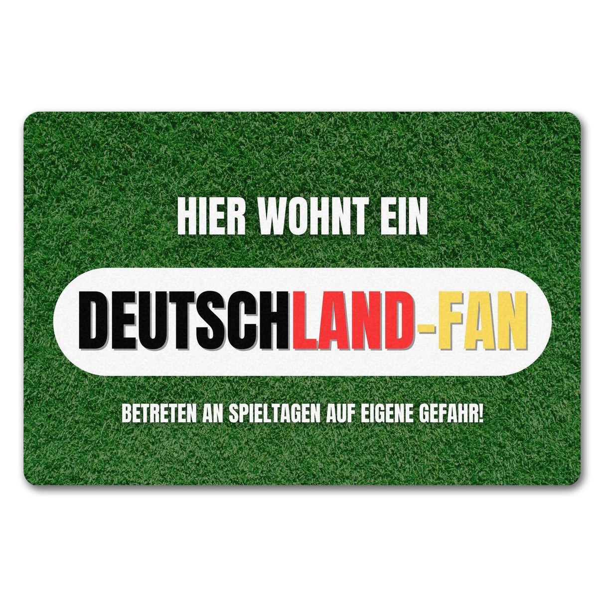 - Hier wohnt ein Deutschland-Fan: Diese Fußmatte ist perfekt für alle, die bei jedem Tor der deutschen Elf laut jubeln! Mit einem saftig-grünen Fußballrasen-Design und dem lustigen Spruch "Betreten an Spieltagen auf eigene Gefahr!" wird jeder Besucher sofort wissen, bei wem er gelandet ist.