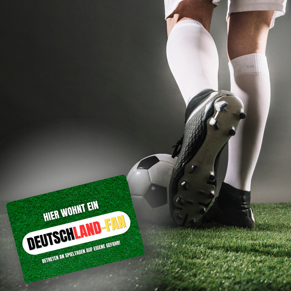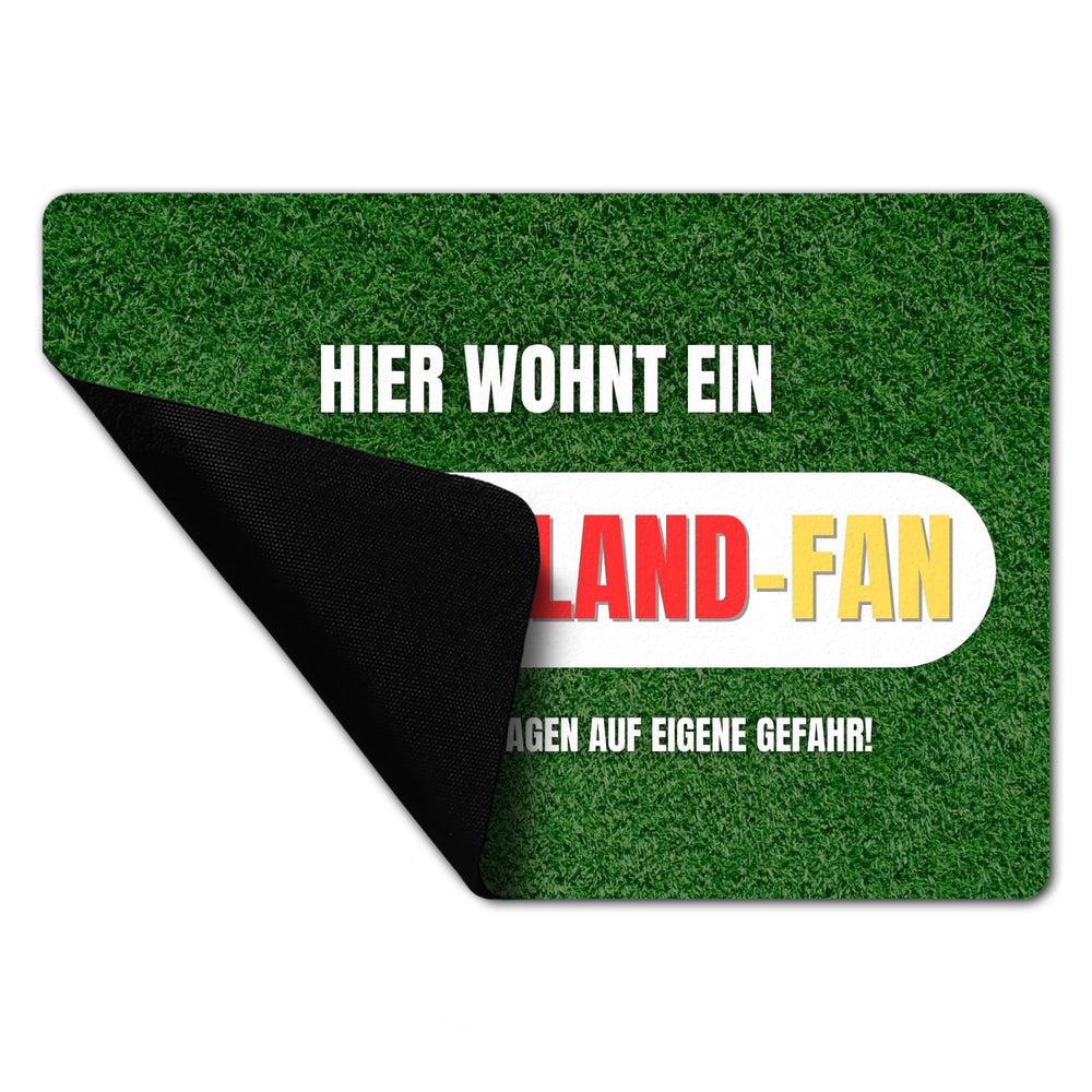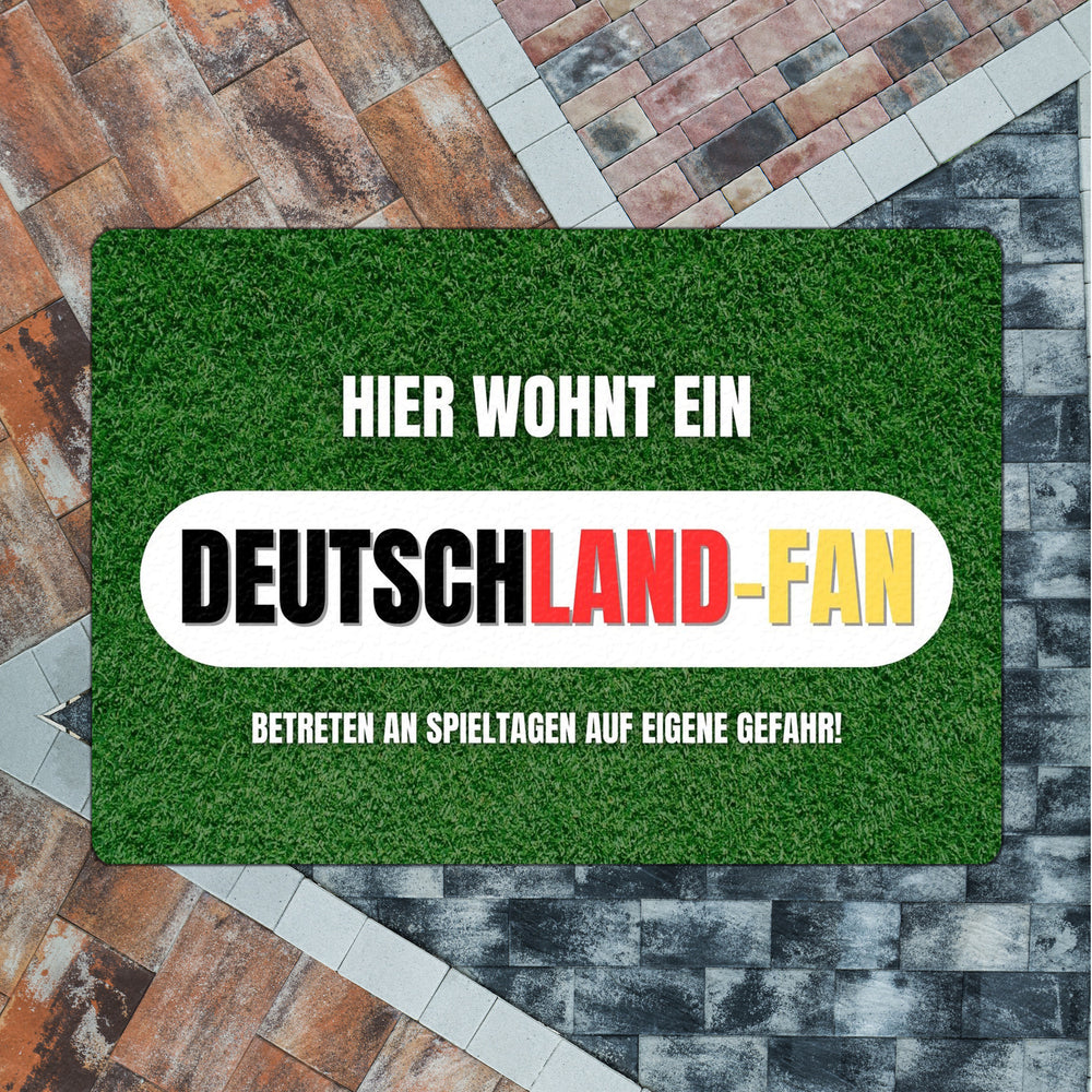 - Hier wohnt ein Deutschland-Fan: Diese Fußmatte ist perfekt für alle, die bei jedem Tor der deutschen Elf laut jubeln! Mit einem saftig-grünen Fußballrasen-Design und dem lustigen Spruch "Betreten an Spieltagen auf eigene Gefahr!" wird jeder Besucher sofort wissen, bei wem er gelandet ist.