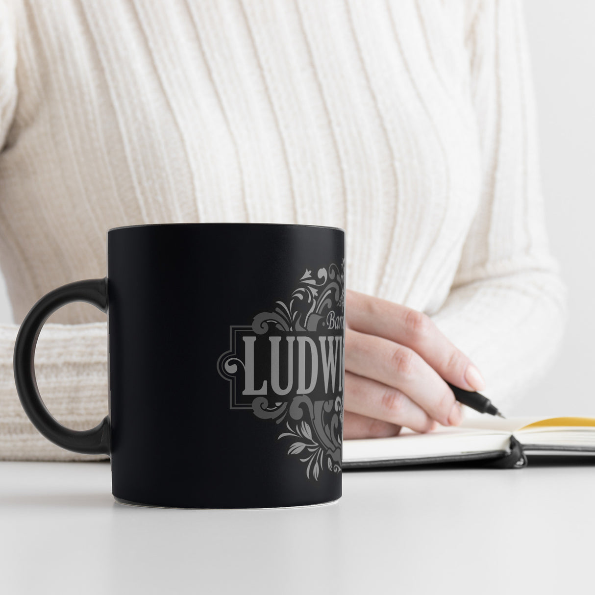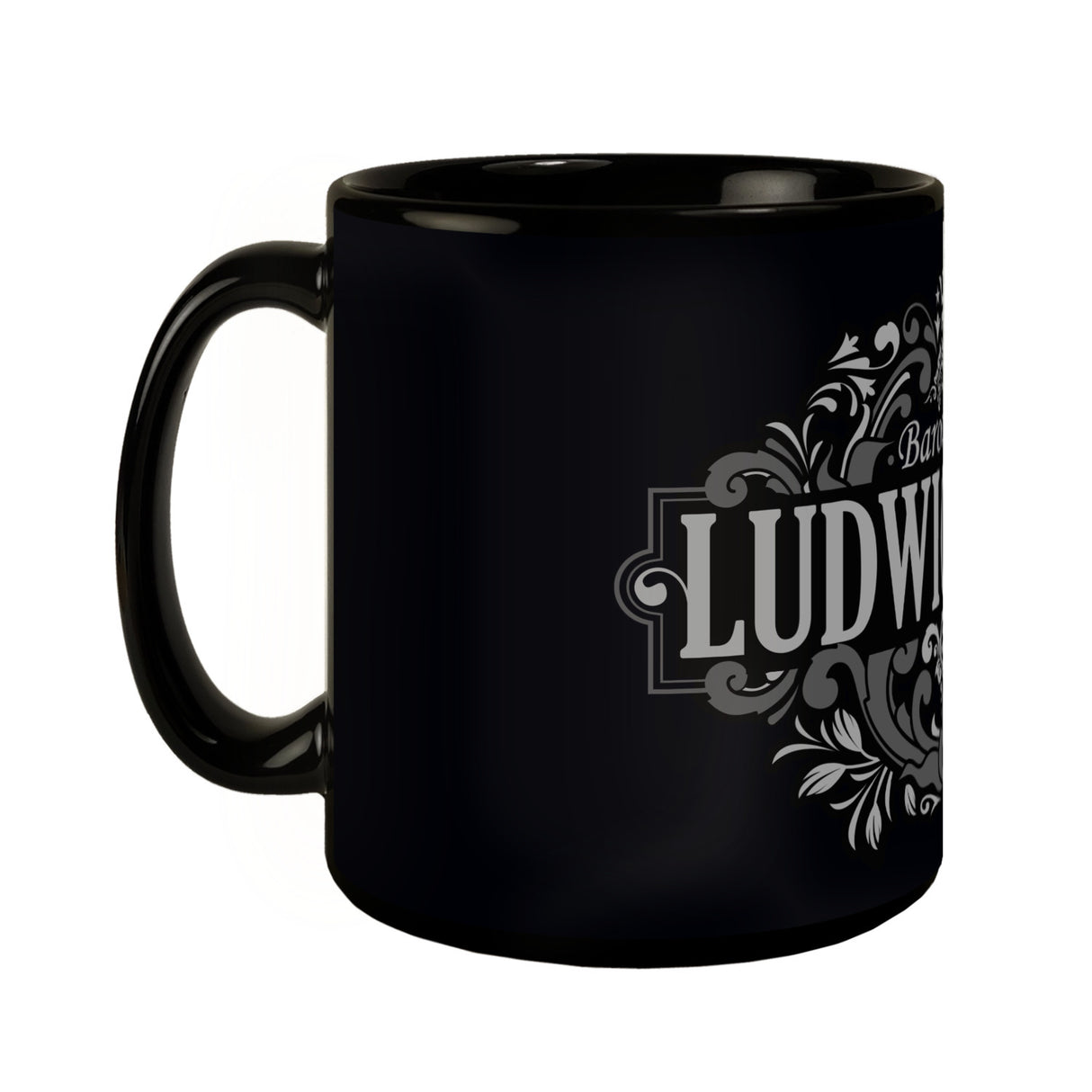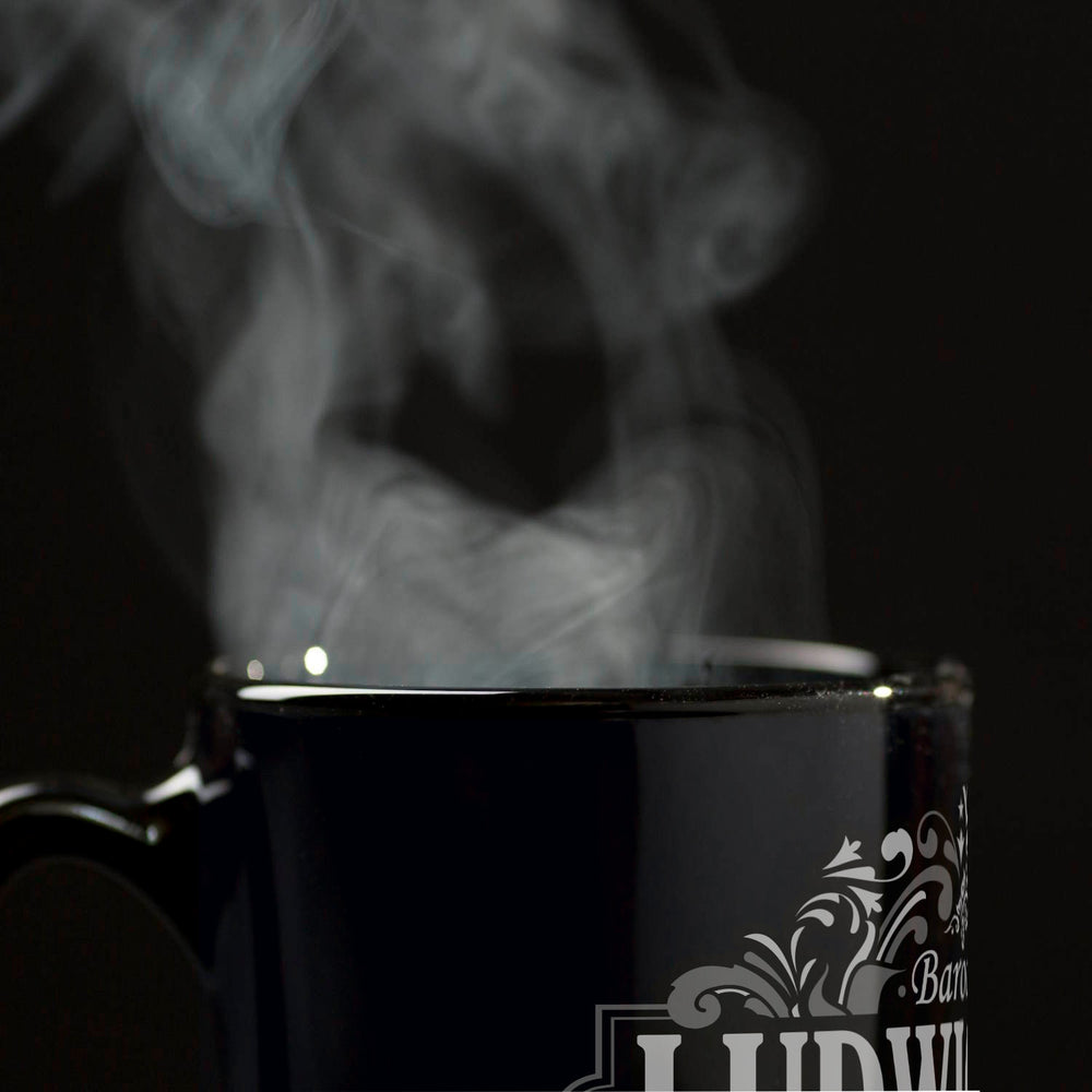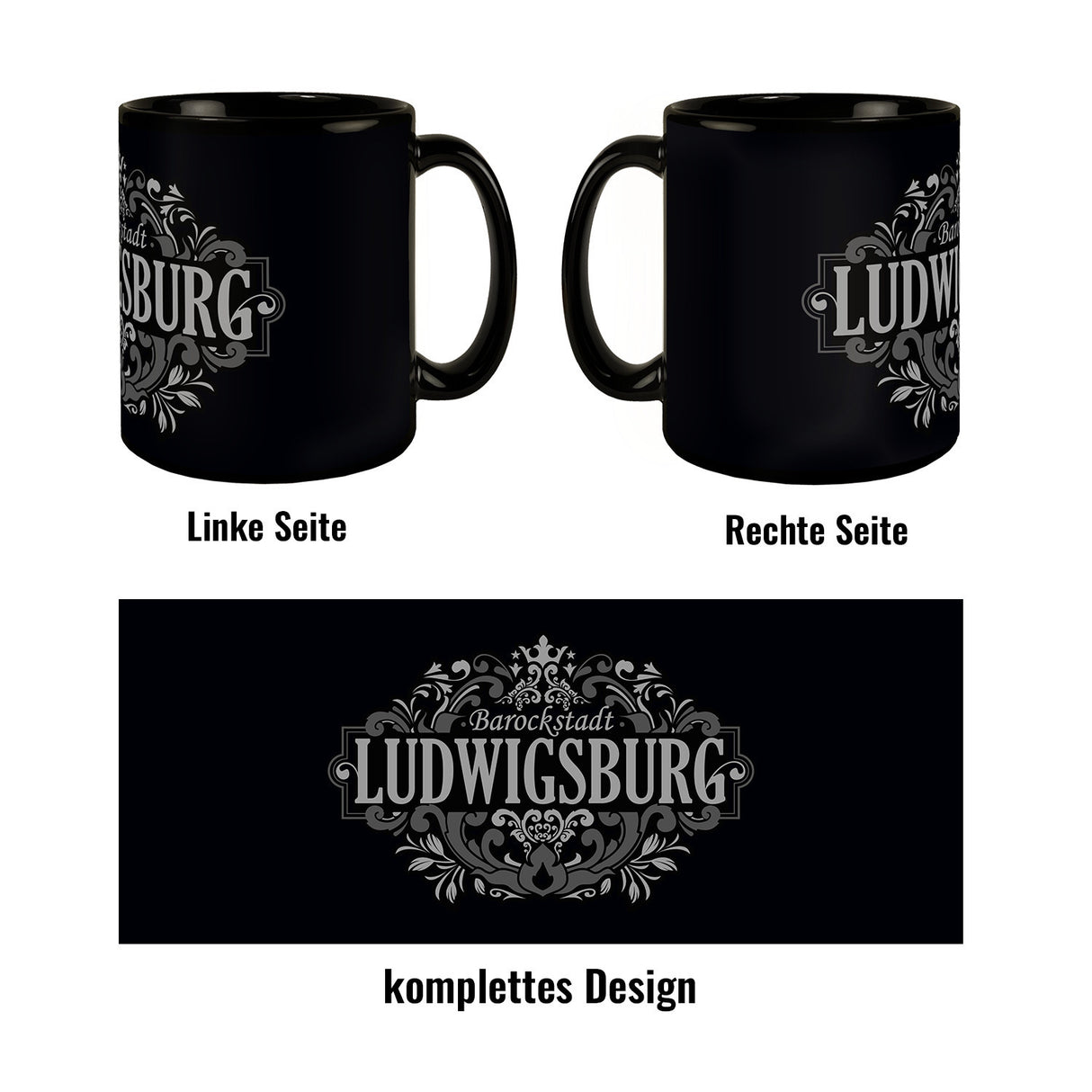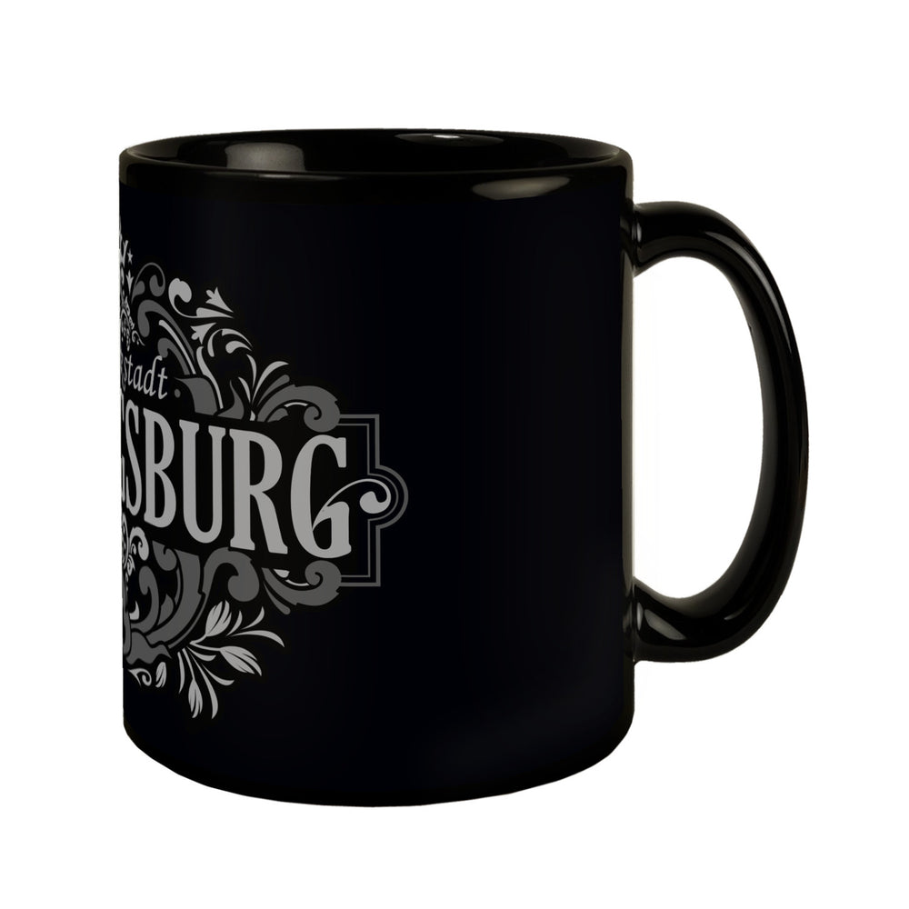 - Diese elegante Tasse hebt sich durch ihren schwarzen Hintergrund und kunstvolle, weiße Ornamente hervor, die das Wort "Ludwigsburg" umrahmen. Oben thront majestätisch eine Krone, darunter prangt der Schriftzug "Barockstadt". Das barocke Design besticht durch florale Muster und geschwungene Linien, inspiriert von der prachtvollen Kunst Ludwigsburgs.