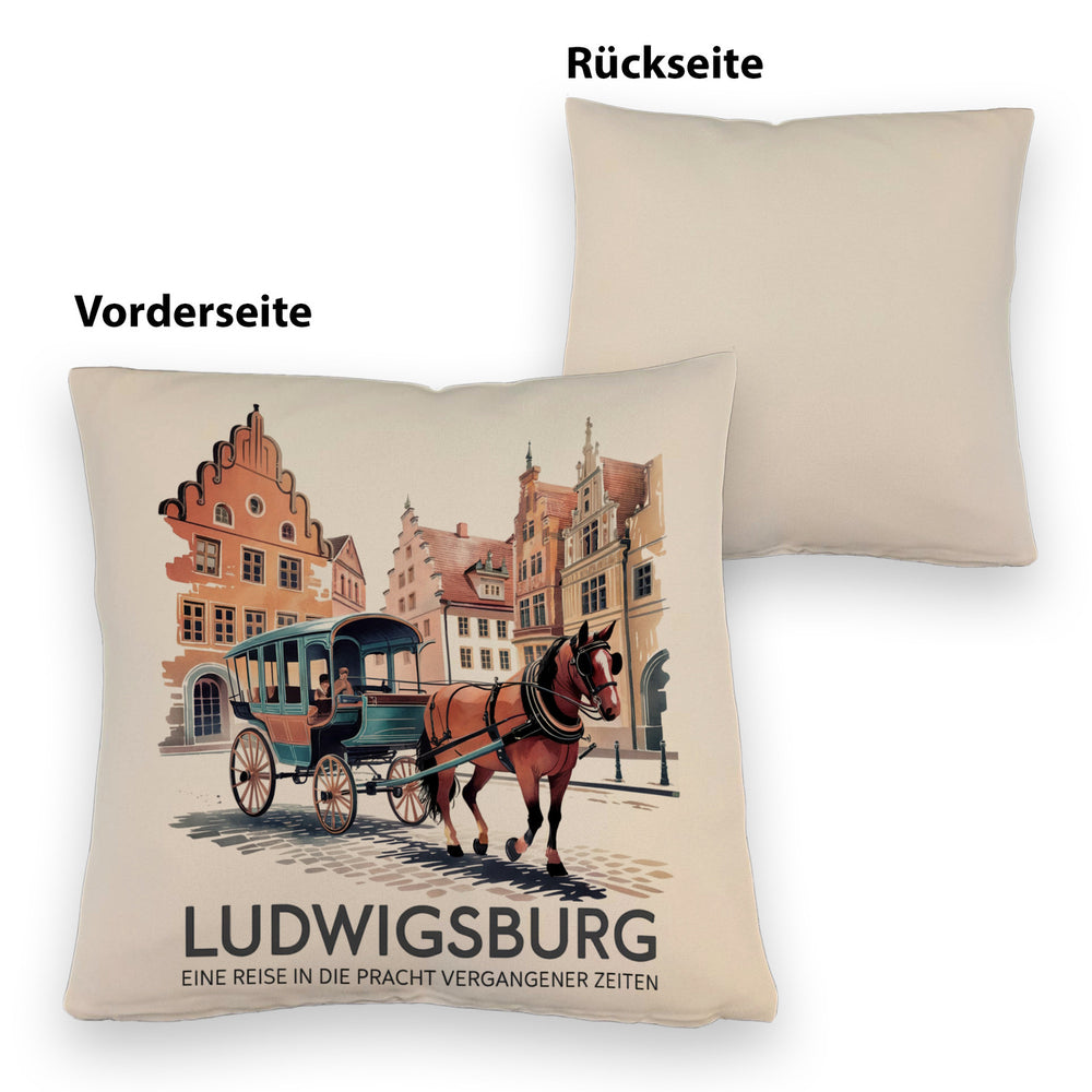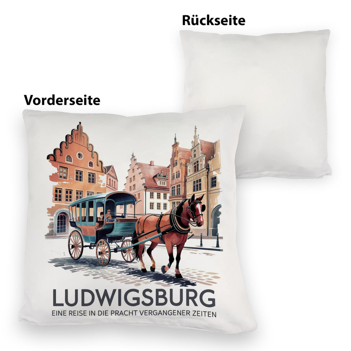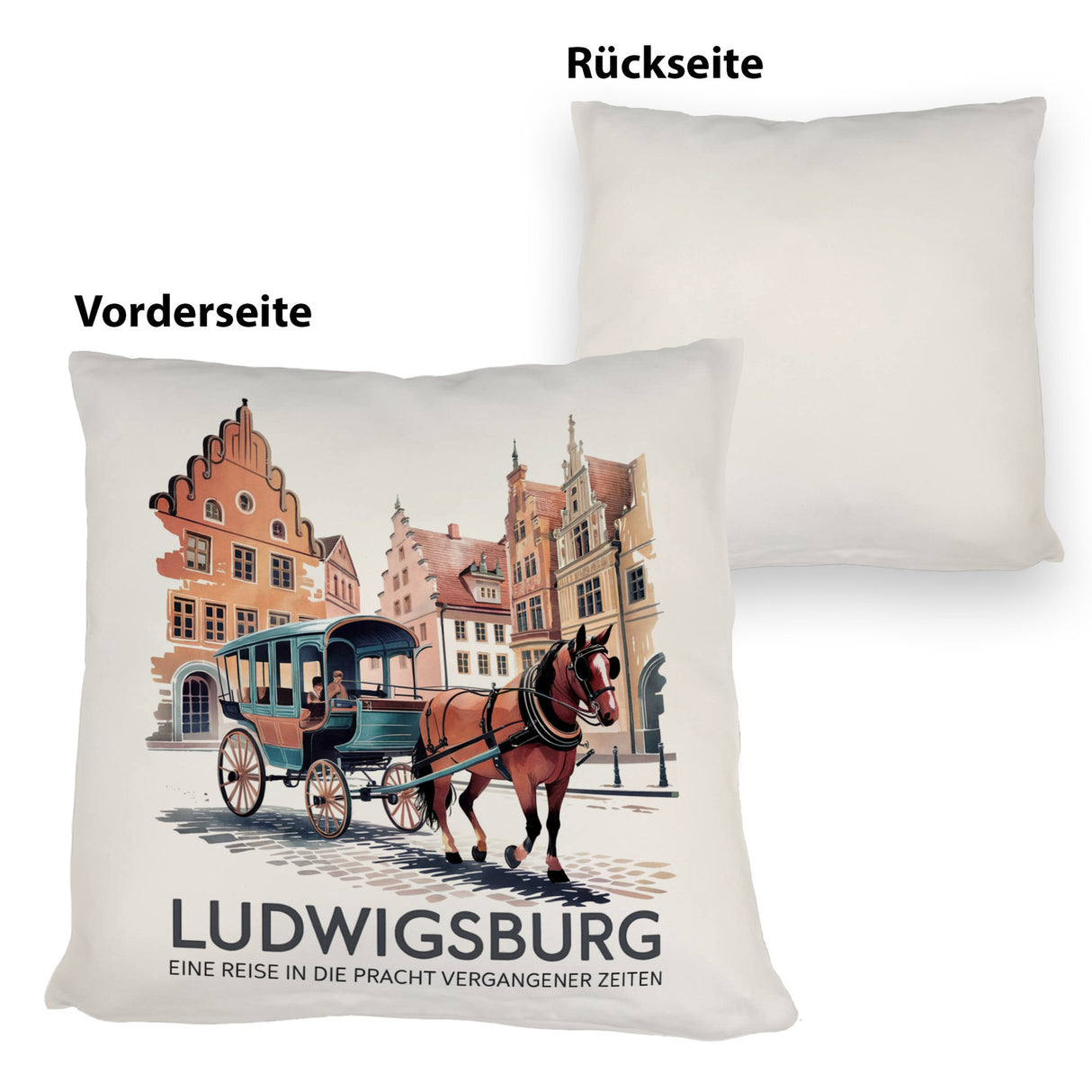 - Tauchen Sie ein in die nostalgische Atmosphäre des Ludwigsburg Reise Kissens! Ein prächtiges Design mit einer lebhaften Pferdekutsche auf Kopfsteinpflaster vor malerischen, historischen Gebäuden. Die typografischen Aquarell-Pastellfarben auf weißem Hintergrund bringen Schwung und Eleganz in Ihr Zuhause. Ein echtes Schmuckstück für jeden Raum!