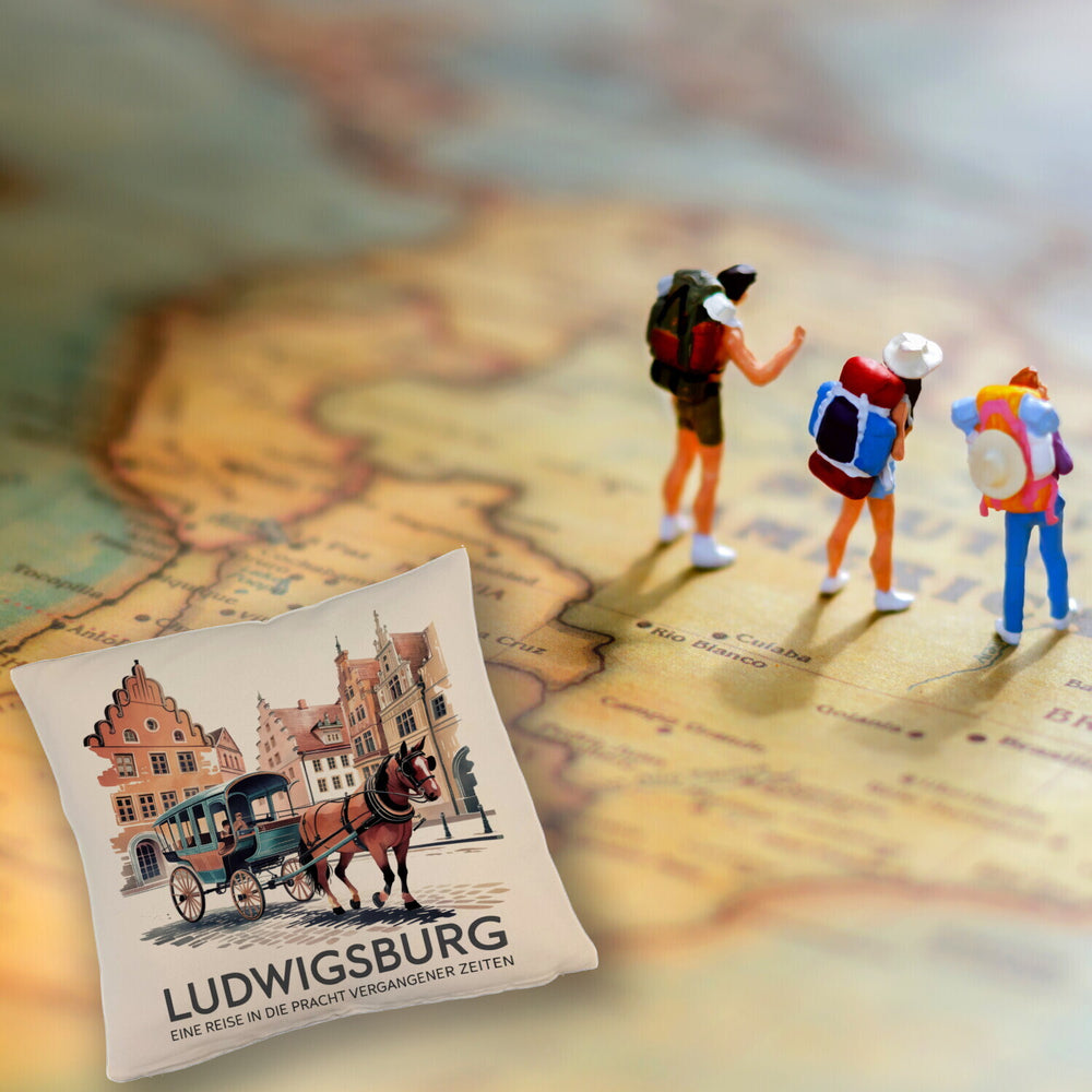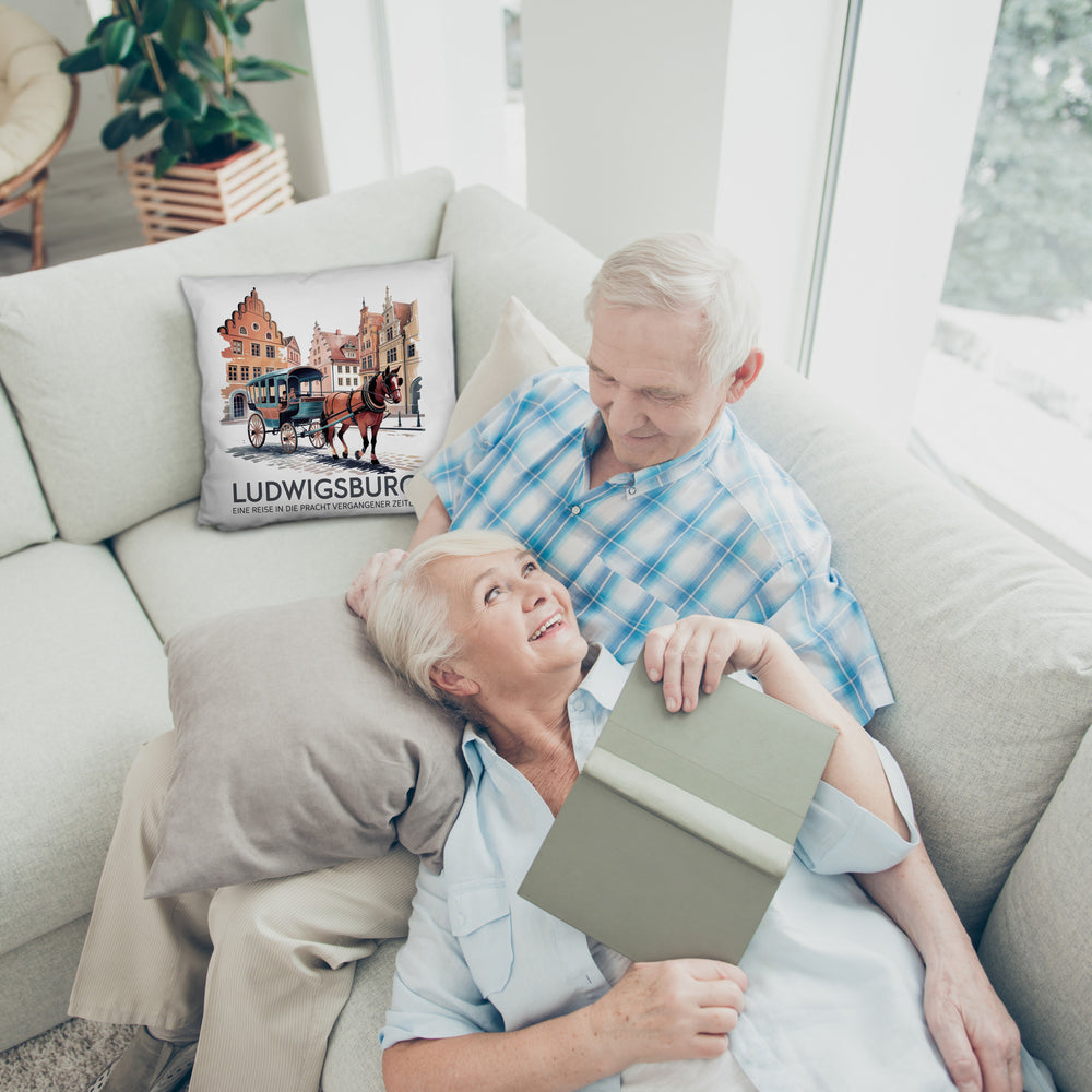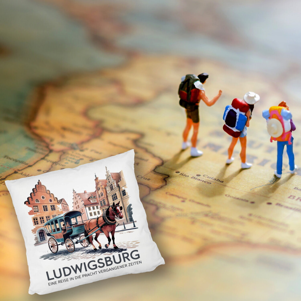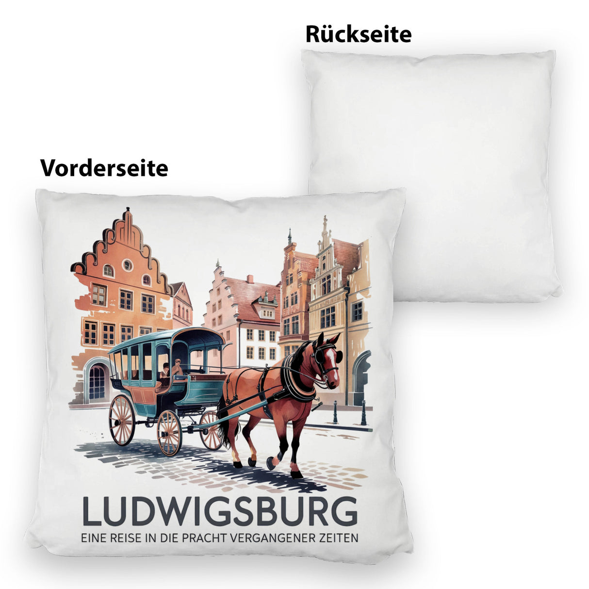 - Tauchen Sie ein in die nostalgische Atmosphäre des Ludwigsburg Reise Kissens! Ein prächtiges Design mit einer lebhaften Pferdekutsche auf Kopfsteinpflaster vor malerischen, historischen Gebäuden. Die typografischen Aquarell-Pastellfarben auf weißem Hintergrund bringen Schwung und Eleganz in Ihr Zuhause. Ein echtes Schmuckstück für jeden Raum!