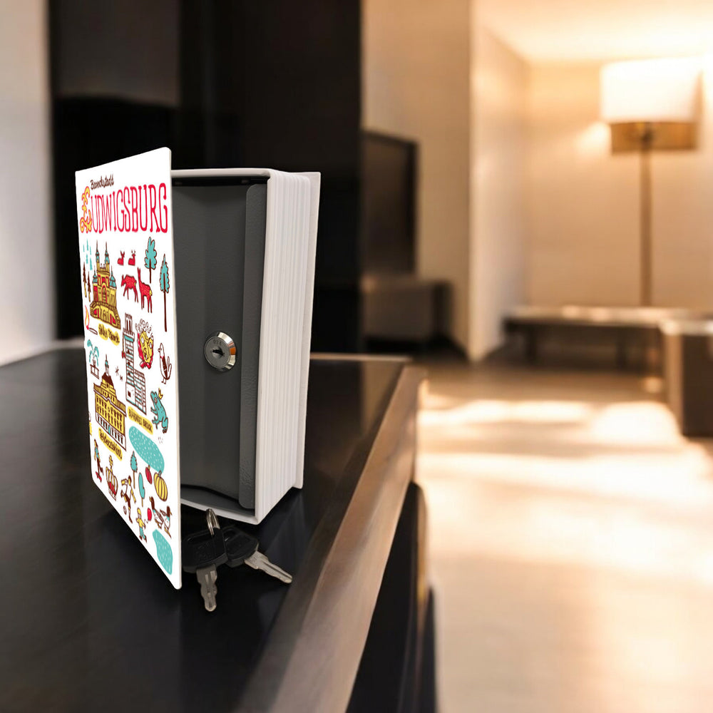 - Der Ludwigsburg Wimmelbild Booksafe ist ein lebendiges Kunstwerk, das die farbenfrohe Stadt Ludwigsburg zeigt. Die Illustrationen umfassen berühmte Wahrzeichen, Alltagsszenen und spielerische Elemente wie Brezeln und Kronen. Gedruckt auf einem sicheren Buchversteck, ist es nicht nur ästhetisch ansprechend, sondern auch funktional.