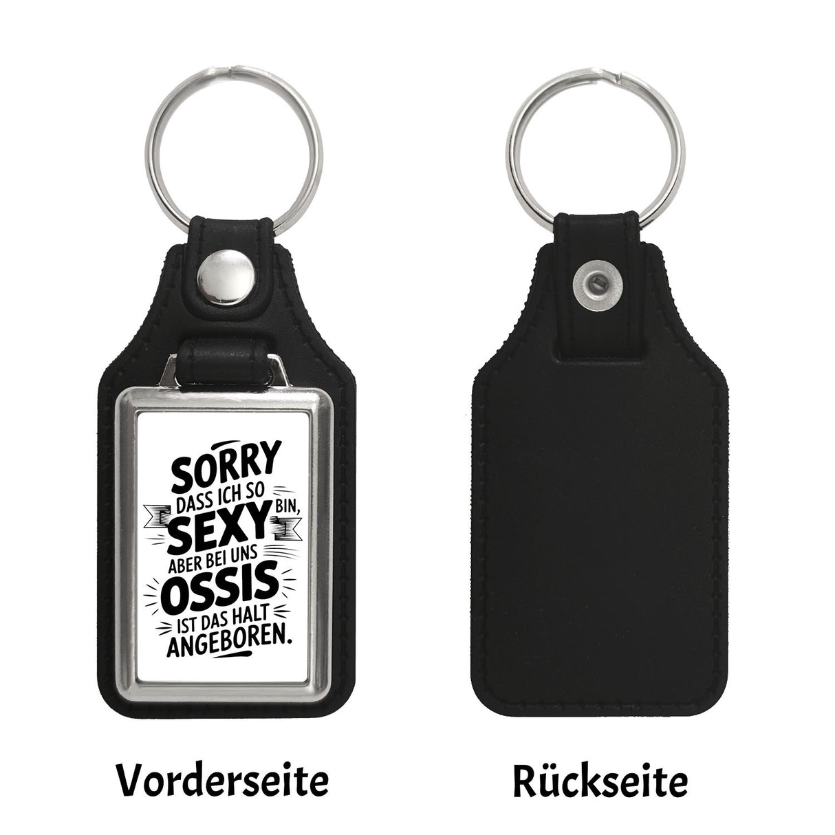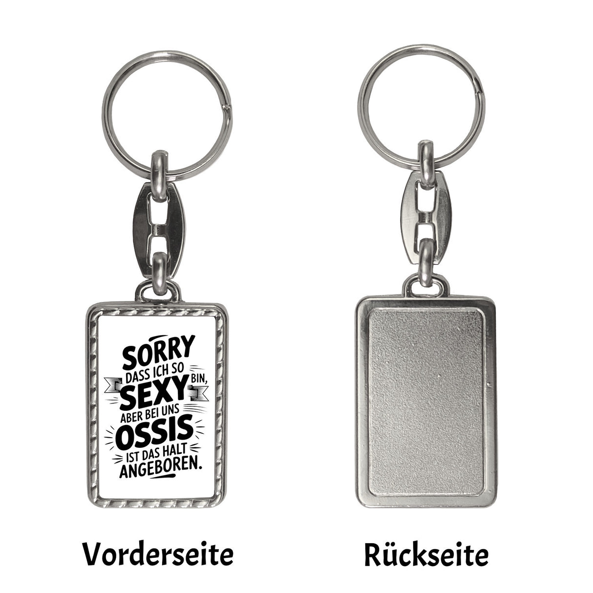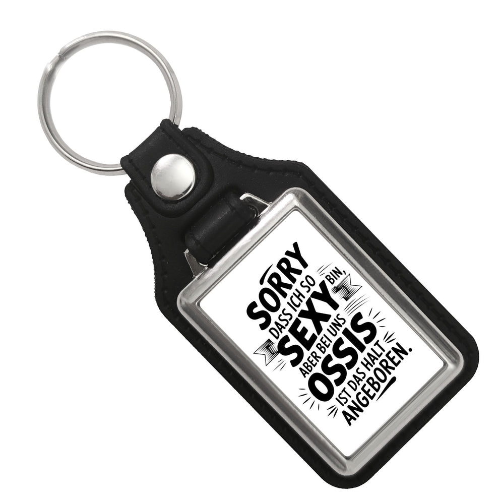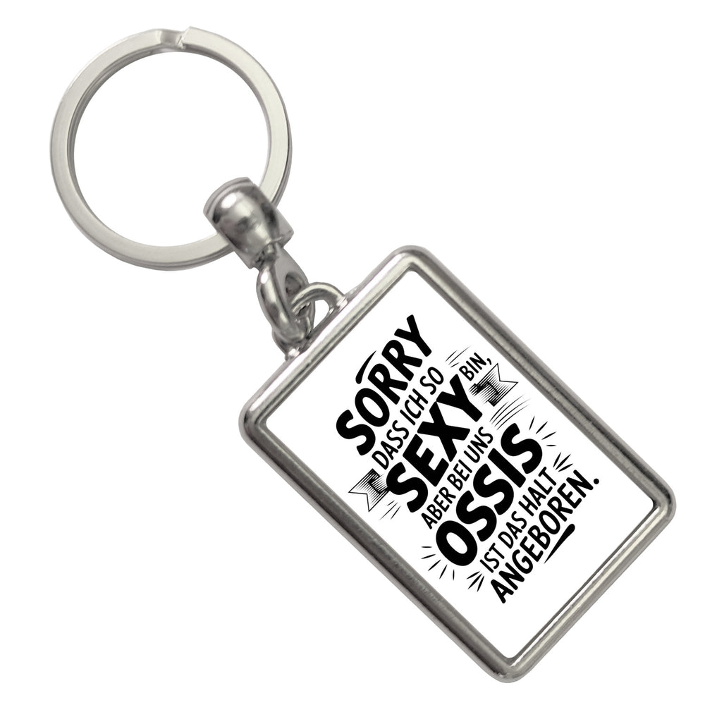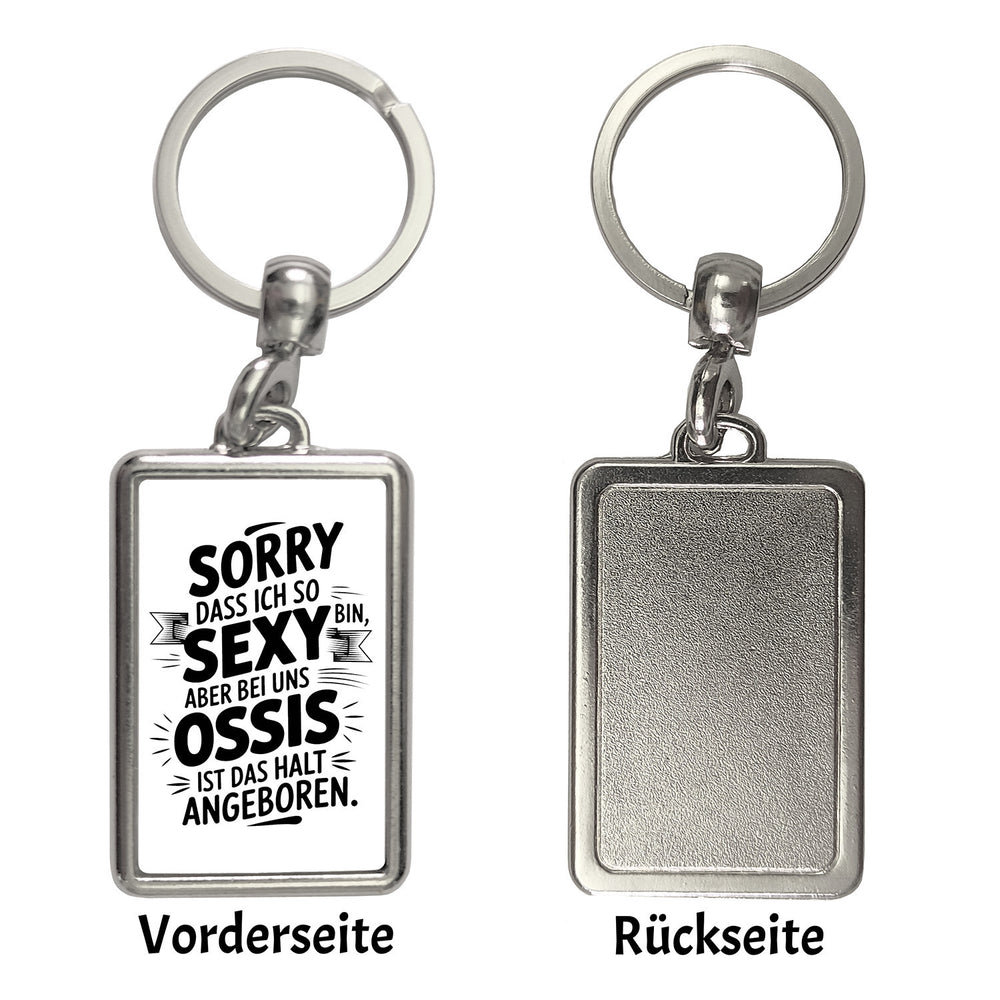• Dieser Schlüsselanhänger bringt den Ossi-Humor direkt an deinen Schlüsselbund! Mit dem frechen Spruch "Sorry, dass ich so sexy bin, aber bei uns OSSIS ist das halt angeboren" wird jeder Alltag zu einem Lächeln. In auffälligen Großbuchstaben und mit verspielten Elementen, hebt sich das Design auf dem weißen Hintergrund hervor.