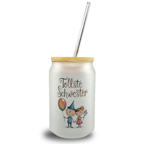 Tollste Schwester Cartoon Trinkglas mit Bambusdeckel für Geschwister