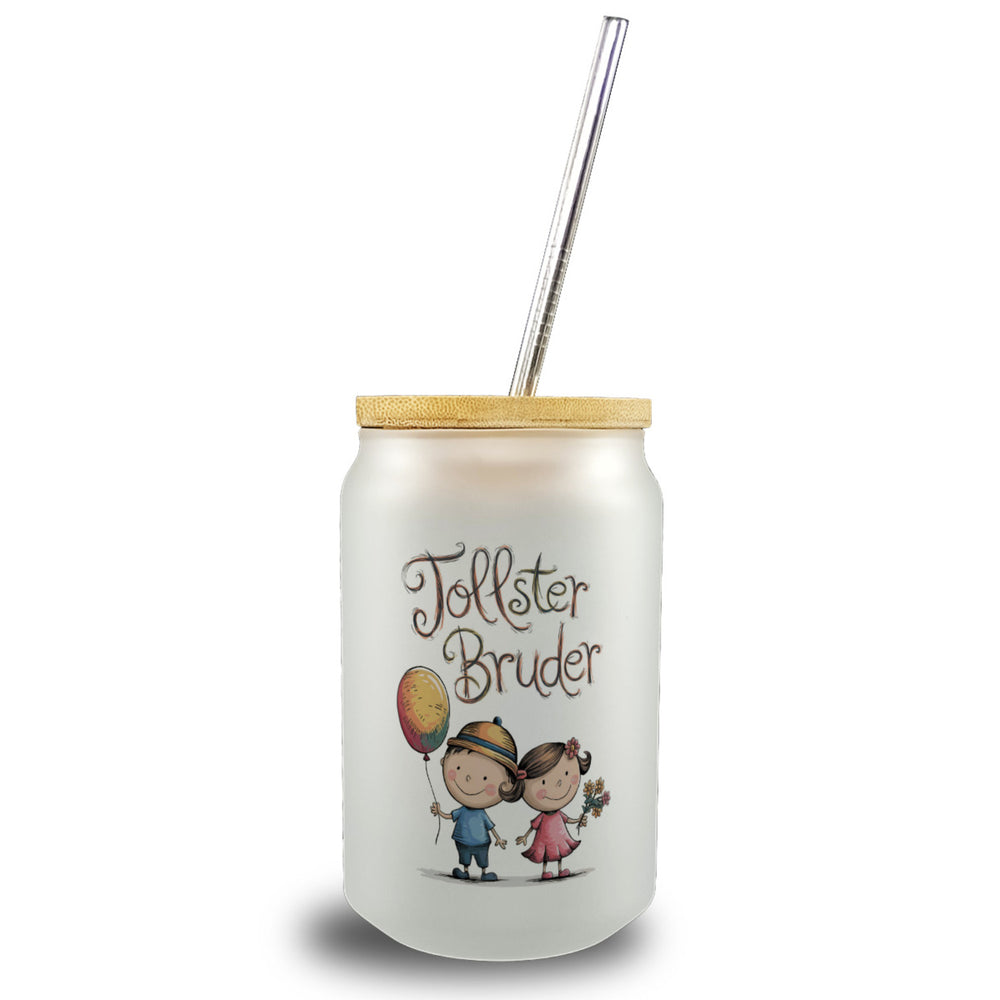 - 1x Tollster Bruder Cartoon Trinkglas mit Bambusdeckel für Geschwister mit Bambusdeckel oder Henkel