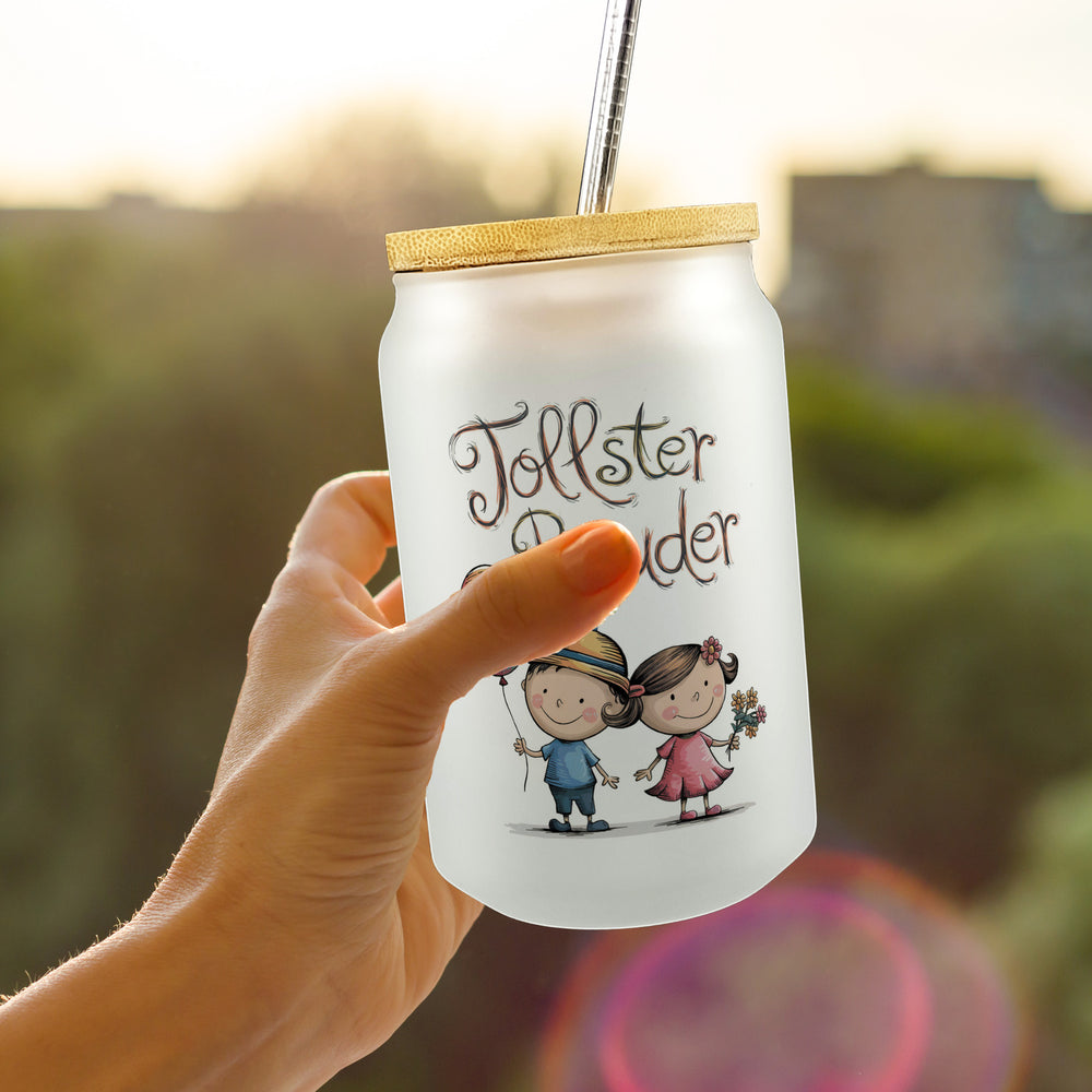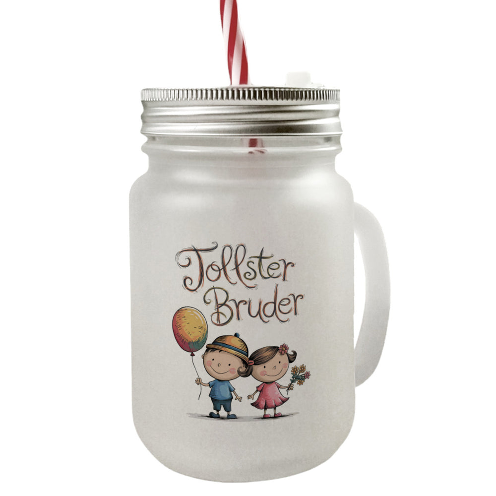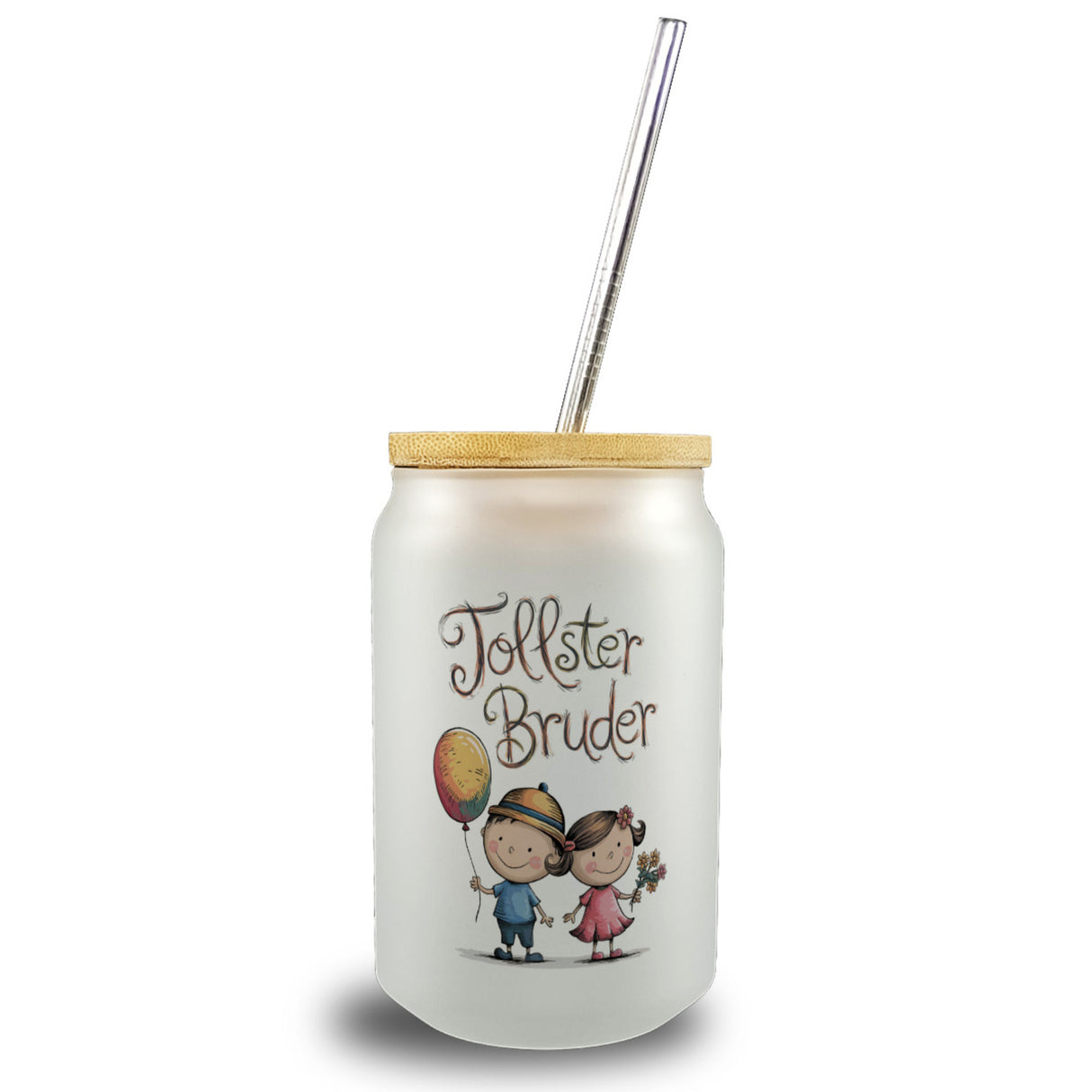 - Dieses Trinkglas ist ein humorvolles Kunstwerk mit einem verspielten Cartoon-Design, das einen Bruder im blauen Hemd und seine Schwester im pinken Kleid zeigt. Beide halten lustige Accessoires – einen bunten Ballon und einen Blumenstrauß. Über ihnen schwebt der verspielte Schriftzug „tollster Bruder“ auf einem schlichten weißen Hintergrund.